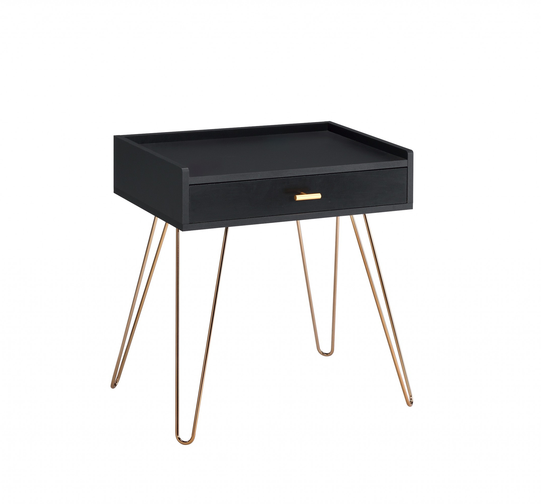 Show off your exquisite taste with this 24-inch gold and black end table with drawer. Quality construction from the gold metal base combines with black manufactured wood of the top to give this table a fresh and updated look. Includes a single easy pull out drawer for handy storage of life's little essentials. A great accent on either side of the sofa or bed, this adorable end or side table is just what you need. You can match it with other pieces to get the ideal look for your place. 23.5-inch H x 15.25-inch W x 22.1-inch D