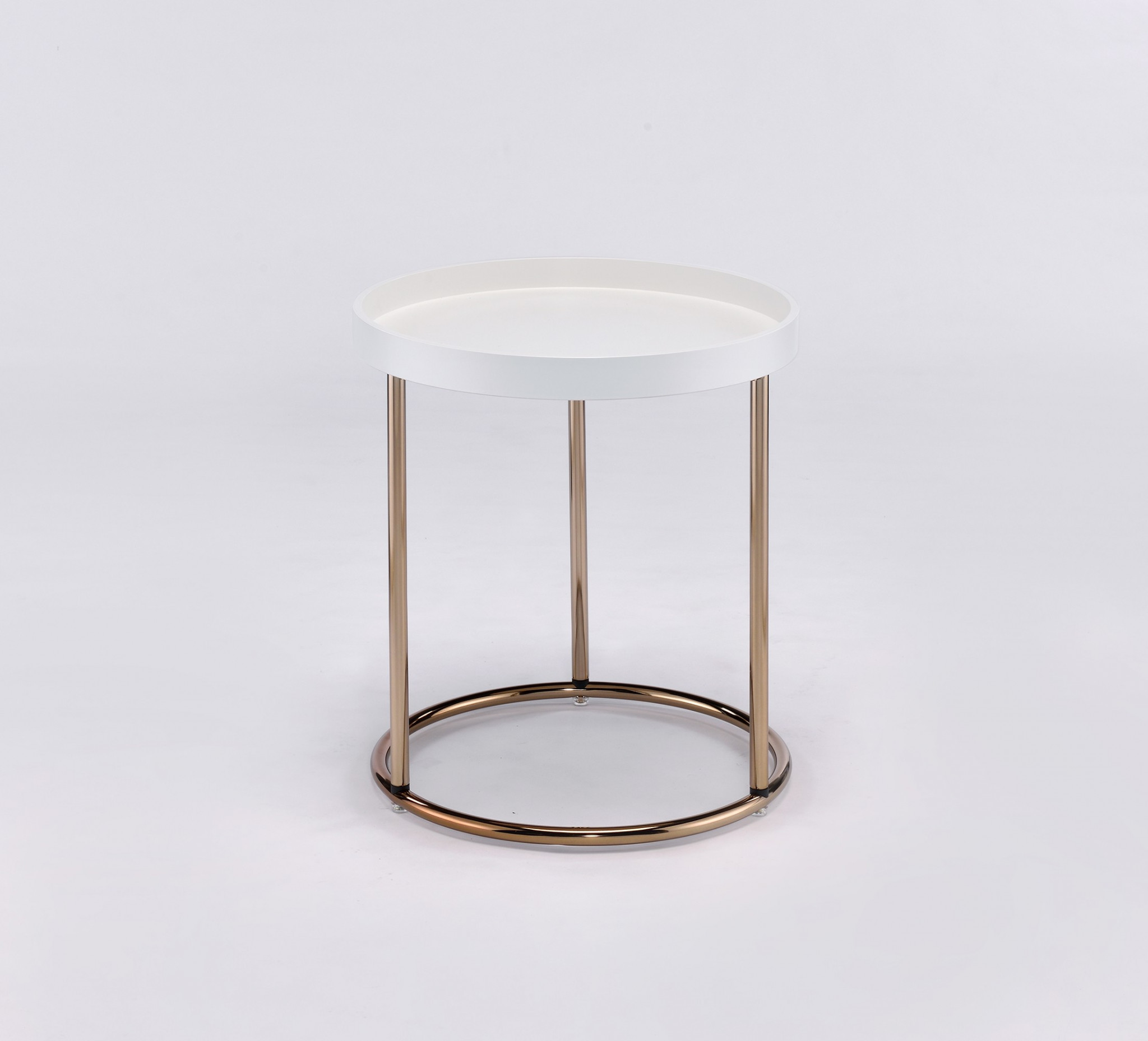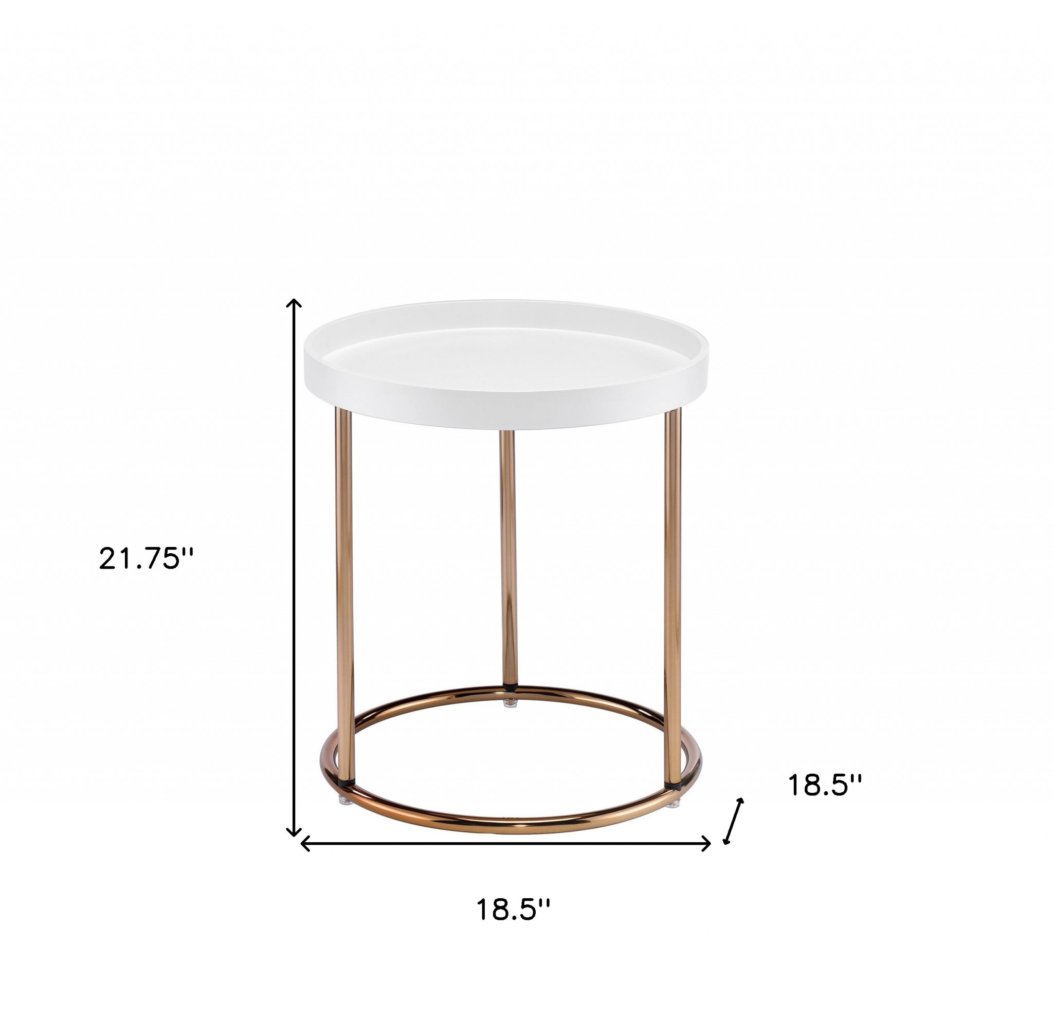Optimize your space and add some charm to your room with the 22-inch copper and white round end table. A copper metal frame is finished off with a white manufactured wood top that is the epitome of quality construction and design. Side tables are a great way to flank your sofa, use as an accent next to your favorite chair, or can even be used bedside. You can match it with other pieces to get the ideal look for your place. 21.75-inch H x 18.5-inch W x 18.5-inch D
