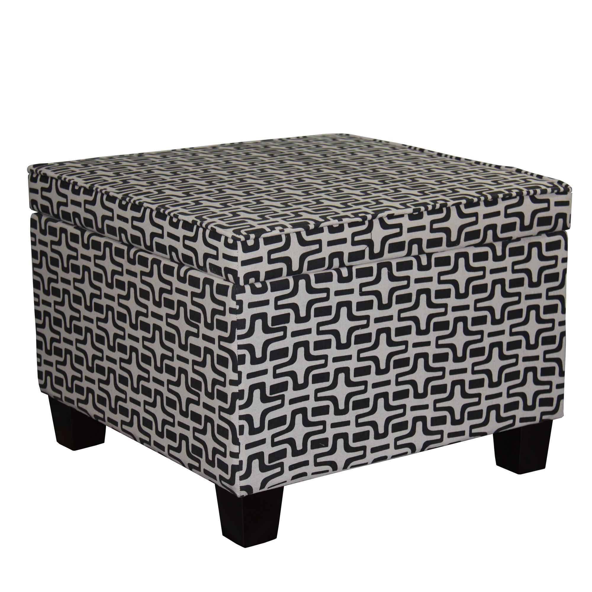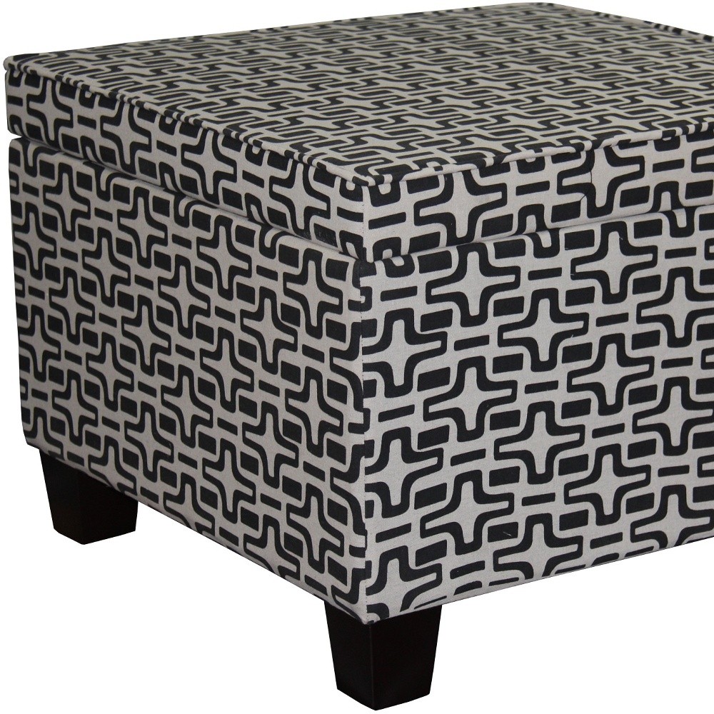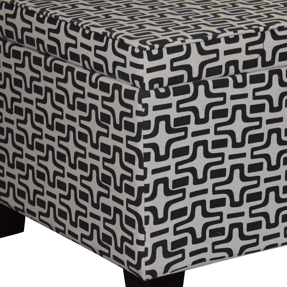 Optimize your space and add some charm to your room with the 25" black and white polyester blend and black geometric storage. Designed to discretely add hidden storage to your room without sacrificing seating or foot rest space. Expertly upholstered with padding and soft polyester blend in a geometric pattern, this ottoman is as comfortable as it is good looking. A convenient flip top gives this ottoman multi-functionality to house hidden storage to help keep your space neat and tidy. Ottomans are multi-functional additions to your space that add fashion and practical value. 16.25" H x 25.1" W x 25.25" D