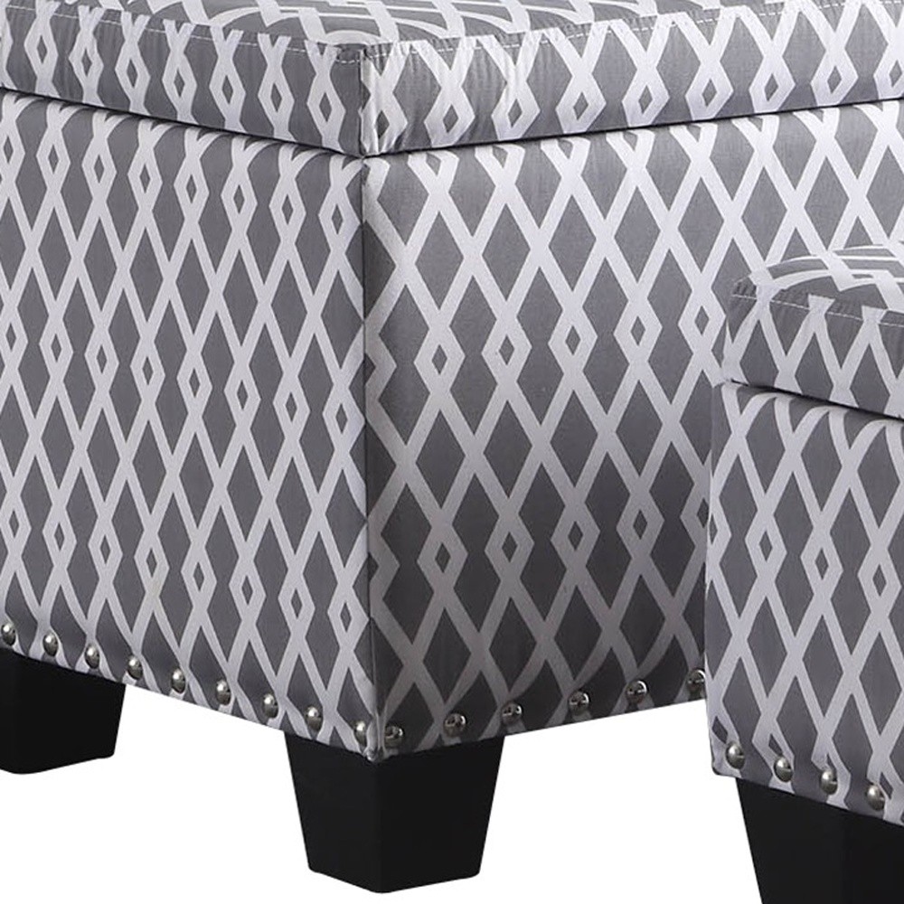 Get ready to relax with this 17-inch gray white black gray and white fabric tufted storage ottoman. Designed to discretely add hidden storage to your room without sacrificing seating or foot rest space. Fine detailing such as nailhead trim give this ottoman a rich and elegant look a convenient flip top gives this ottoman multi-functionality to house hidden storage to help keep your space neat and tidy. Easy to blend into most any room, a ottoman is a way to add a good looking accent to your space that can also be practical and useful. 17-inch h x 17-inch w x 25-inch d.
