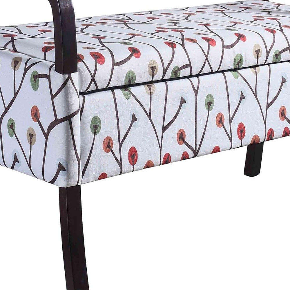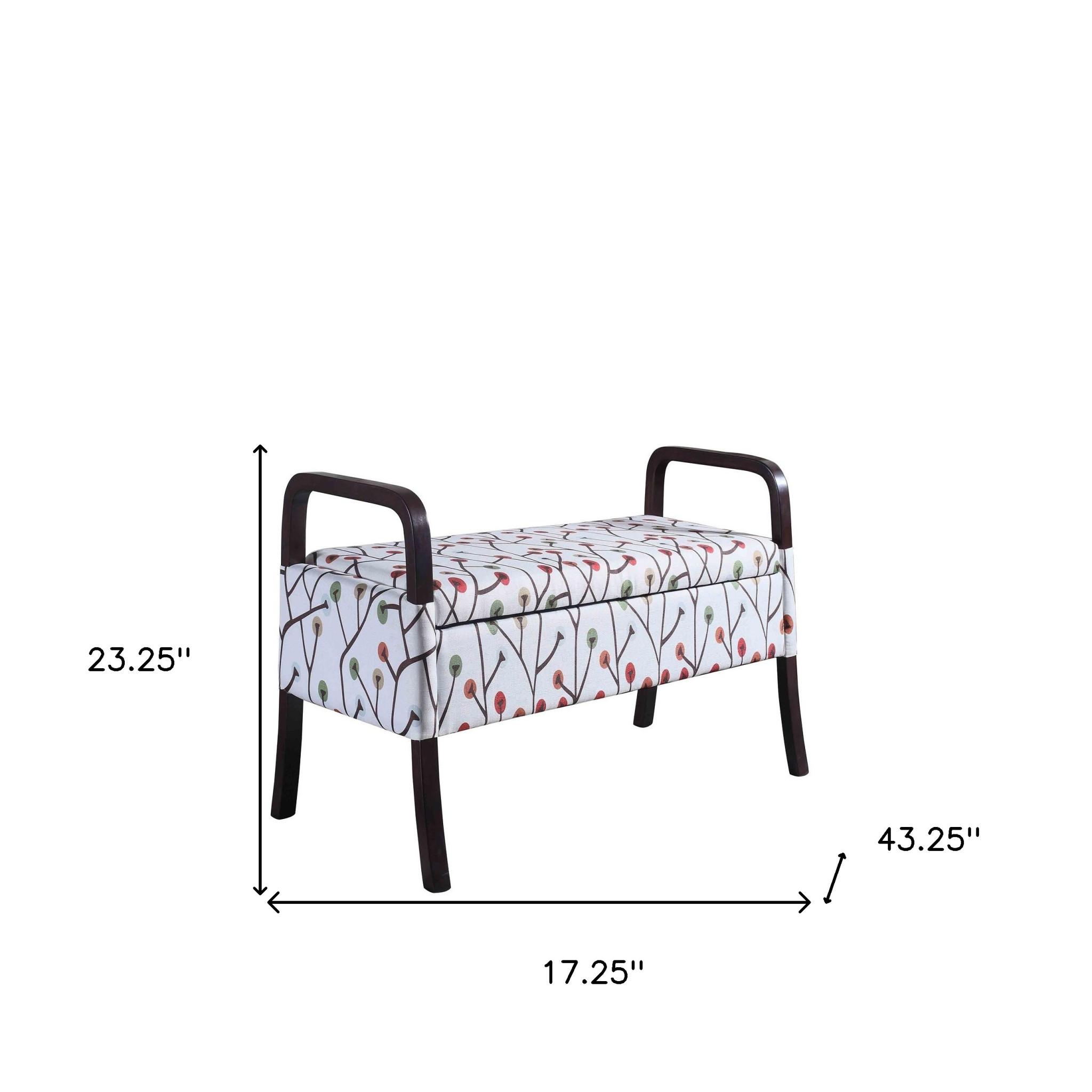 Practicality and fashion mix together with this handy 17" dark brown and blue upholstered 100% polyester floral entryway bench with flip top. A espresso solid wood frame is finished off with a red and white upholstery seat that is the epitomy of quality construction and design. Expertly upholstered with padding and soft 100% polyester in a floral pattern, this bench is as comfortable as it is good looking. A convenient flip top gives this bench multi-functionality to house hidden storage to help keep your space neat and tidy. Ideal for entrance foyer, hallway, or laundry room. This bench is a great place store your keys, put on your shoes, or be a catchall on your way in or out. Easy to blend into most any room, a bench is a way to add a good looking accent to your space that can also be practical and useful. . 23.25" H x 17.25" W x 43.25" D