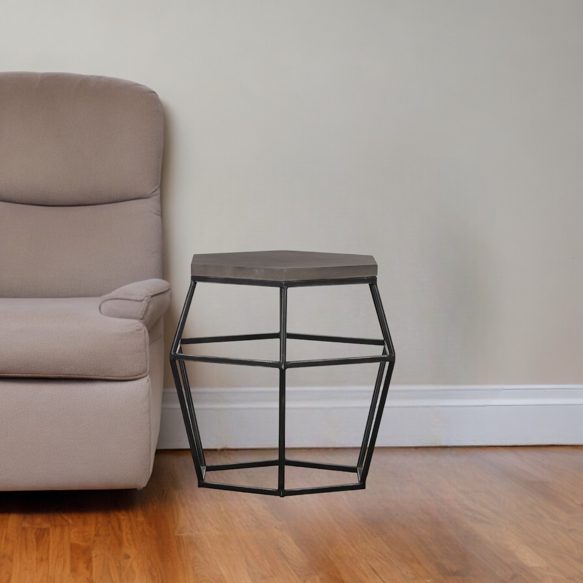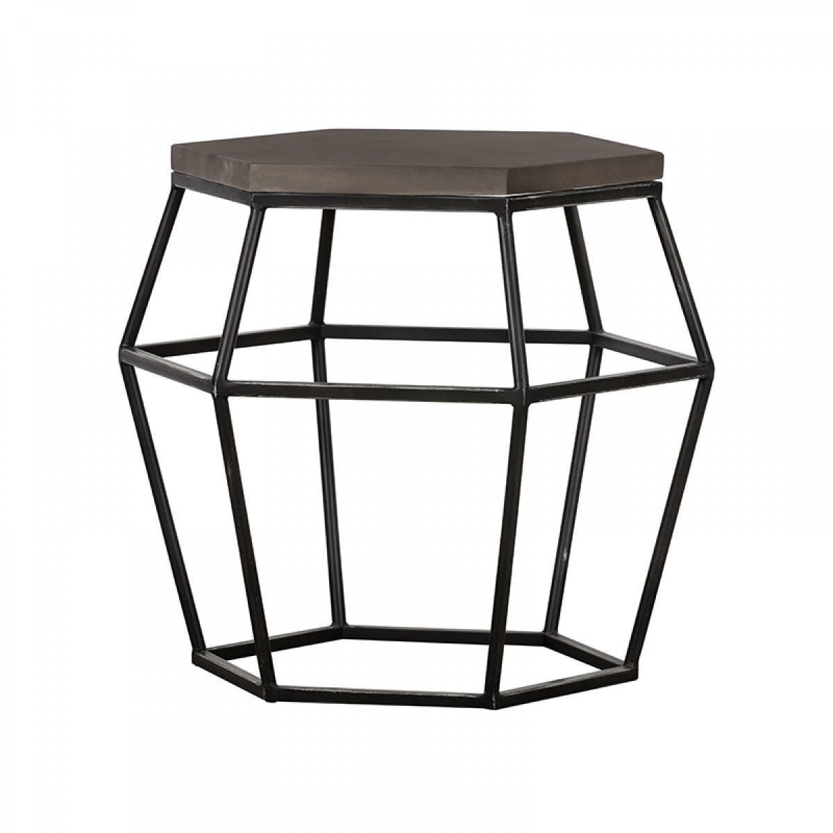 What you need for your home is a fun and unique piece of furnishing, and this Modern Gray Concrete and Black Metal Hexagonal End Table is the perfect choice. This piece is a fusion of a black steel open-air leg frame and a grey concrete tabletop both in a hexagonal shape. The leg frame is an open-air steel structure that uses geometric designs to bring a fresh, modern air to your interior decor. This unique table can be used in most any room indoors or out. 23” x 22” x 22”