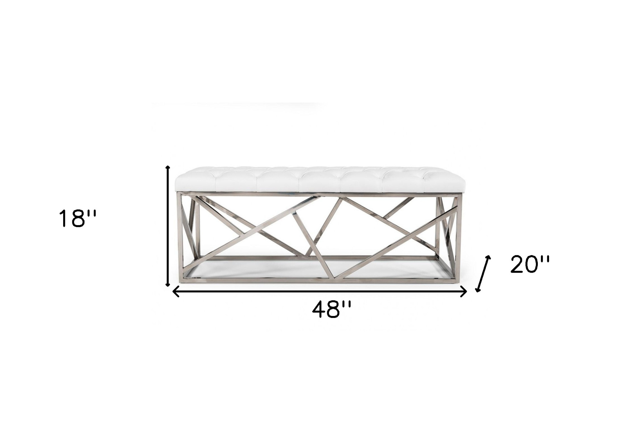 Optimize your space and add some charm to your room with the 48-inch white and silver tufted faux leather upholstered bench. The white upholstery top of this bench is a nice contrast to the high quality, silver steel of the base. Expertly upholstered with padding in a soft solid color faux leather, this bench is as comfortable as it is good looking. Adding this bench to the end of your bed is a great idea to help you get ready in the morning. Benches don't have to be unsightly. Increase your seating and the fashion quotient of your room all at the same time with this hard wearing, versatile, and good looking bench. 18-inch h x 48-inch w x 20-inch d