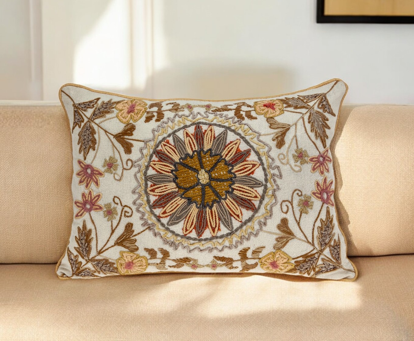 Unique and decorative, this comfortable 14-inch x 20-inch beige cotton throw pillow with embroidery will leave a lasting impression. This beige hued piece represents quality construction, expertly made from durable cotton that is not only long lasting but soft to the touch as well. Super soft and built to hold its shape, this polyfill pillow is a great option. For anyone that loves to decorate or accent their space with color and texture. A great decorative accessory for your favorite chair, to accent your sofa, or to use as part of your bed ensemble. 14-inch H x 20-inch W x 6-inch D