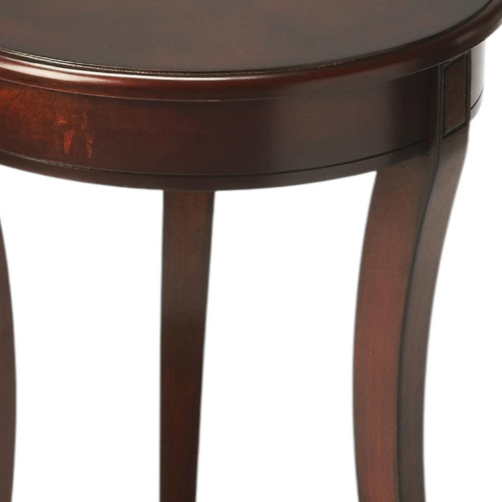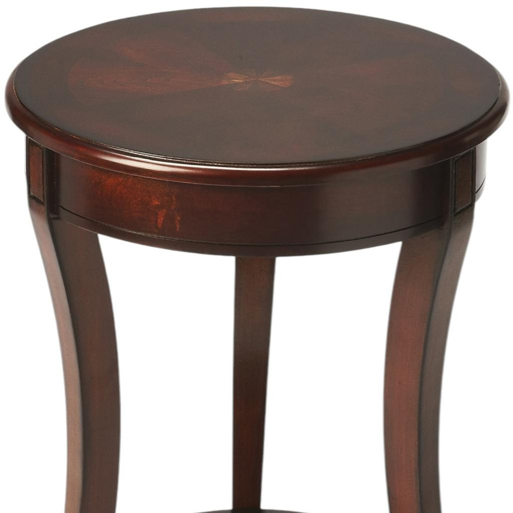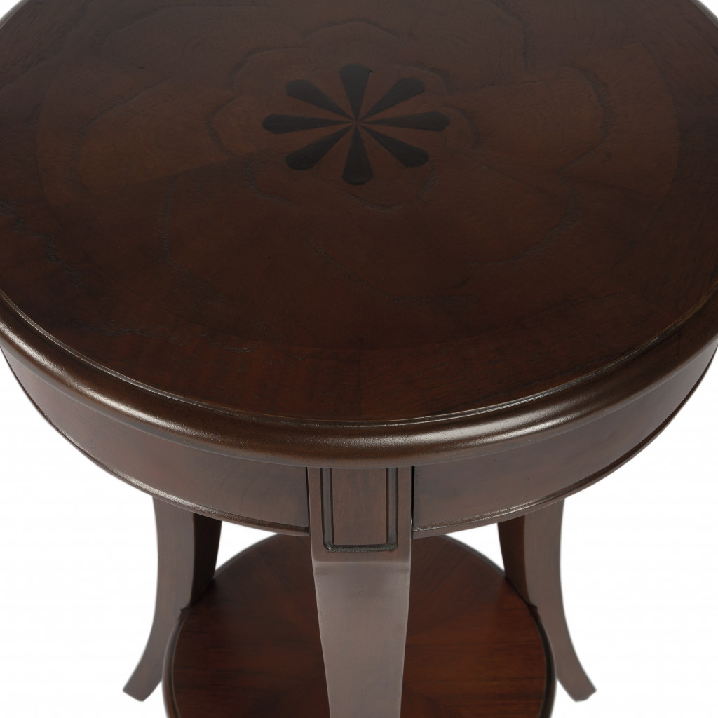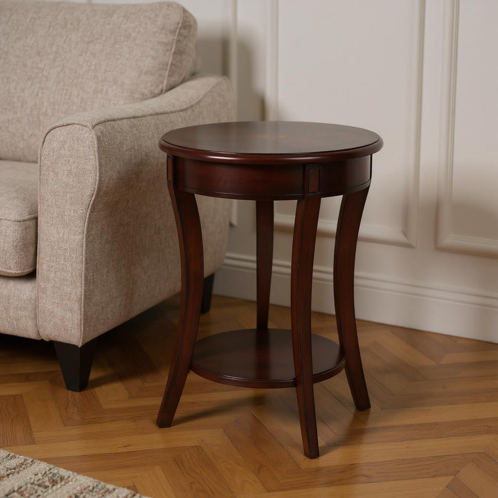 Optimize your space and add some charm to your room with the 26" dark brown and cherry manufactured wood round end table with shelf. The cherry manufactured wood top of this table is a nice contrast to the high quality, dark brown solid and manufactured wood of the base. The purposefully distressed finish gives this table an authentically rustic feel. Includes a single shelf for handy storage or display space. Side tables are a great way to flank your sofa, use as an accent next to your favorite chair, or can even be used bedside. You can also use it as an entryway table to hold your keys. 26" H x 18" W x 18" D