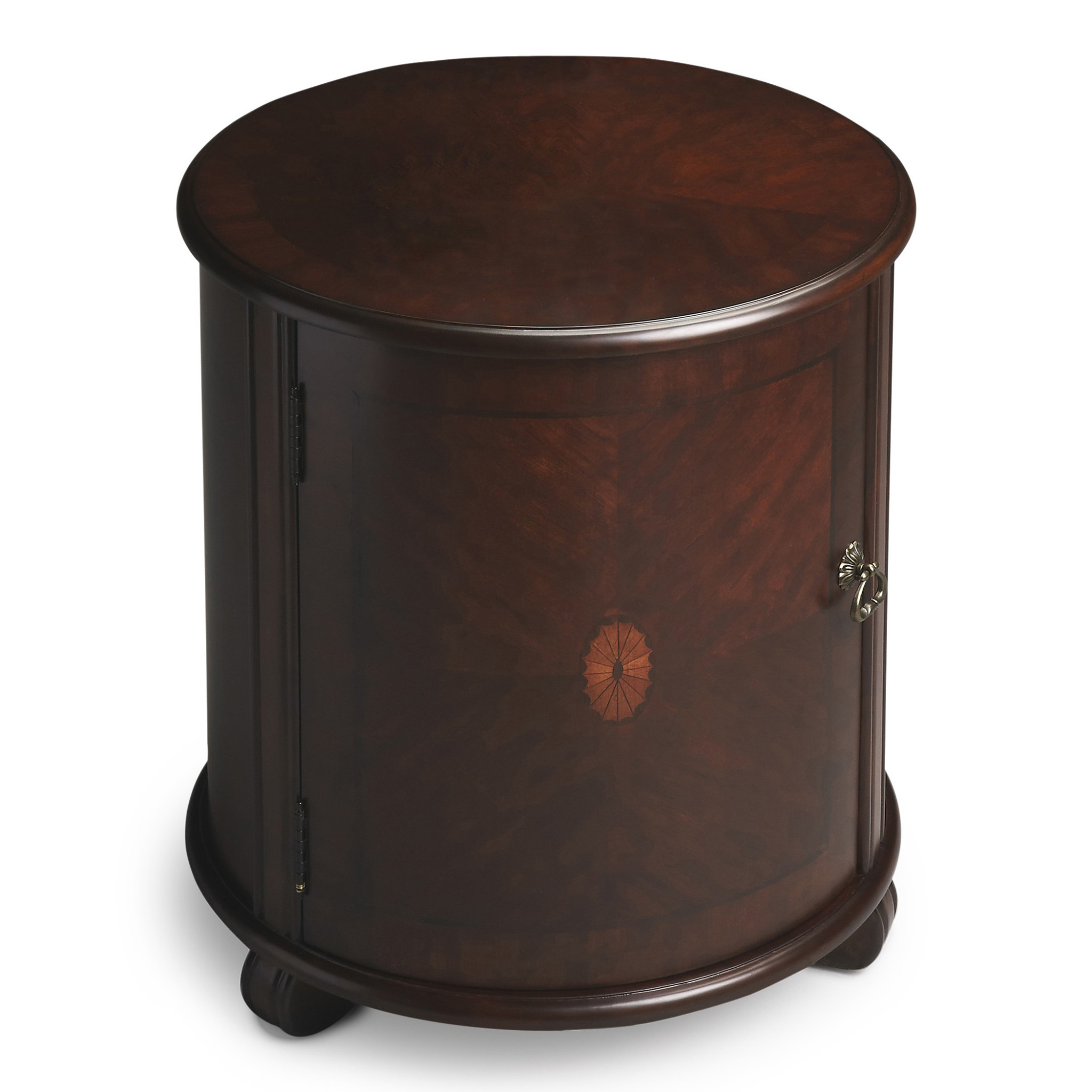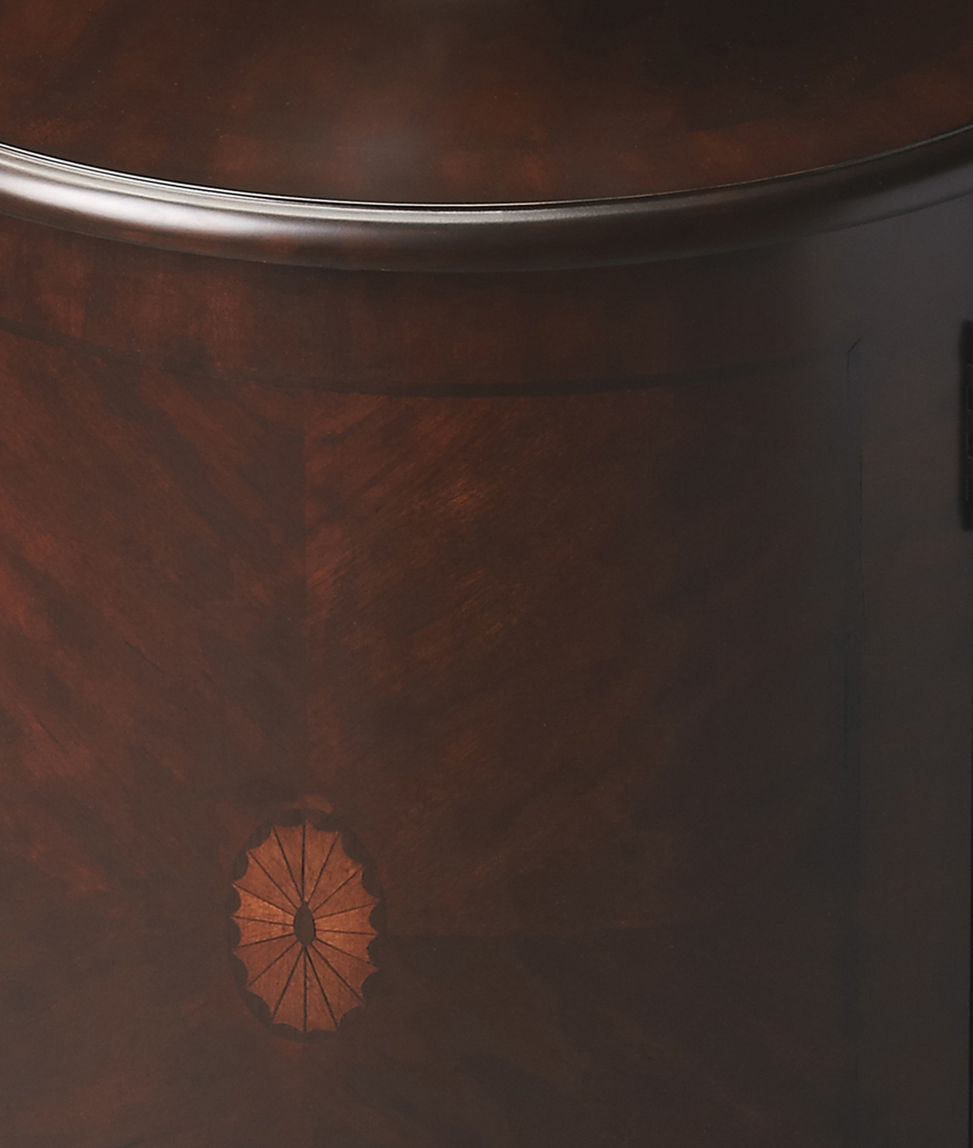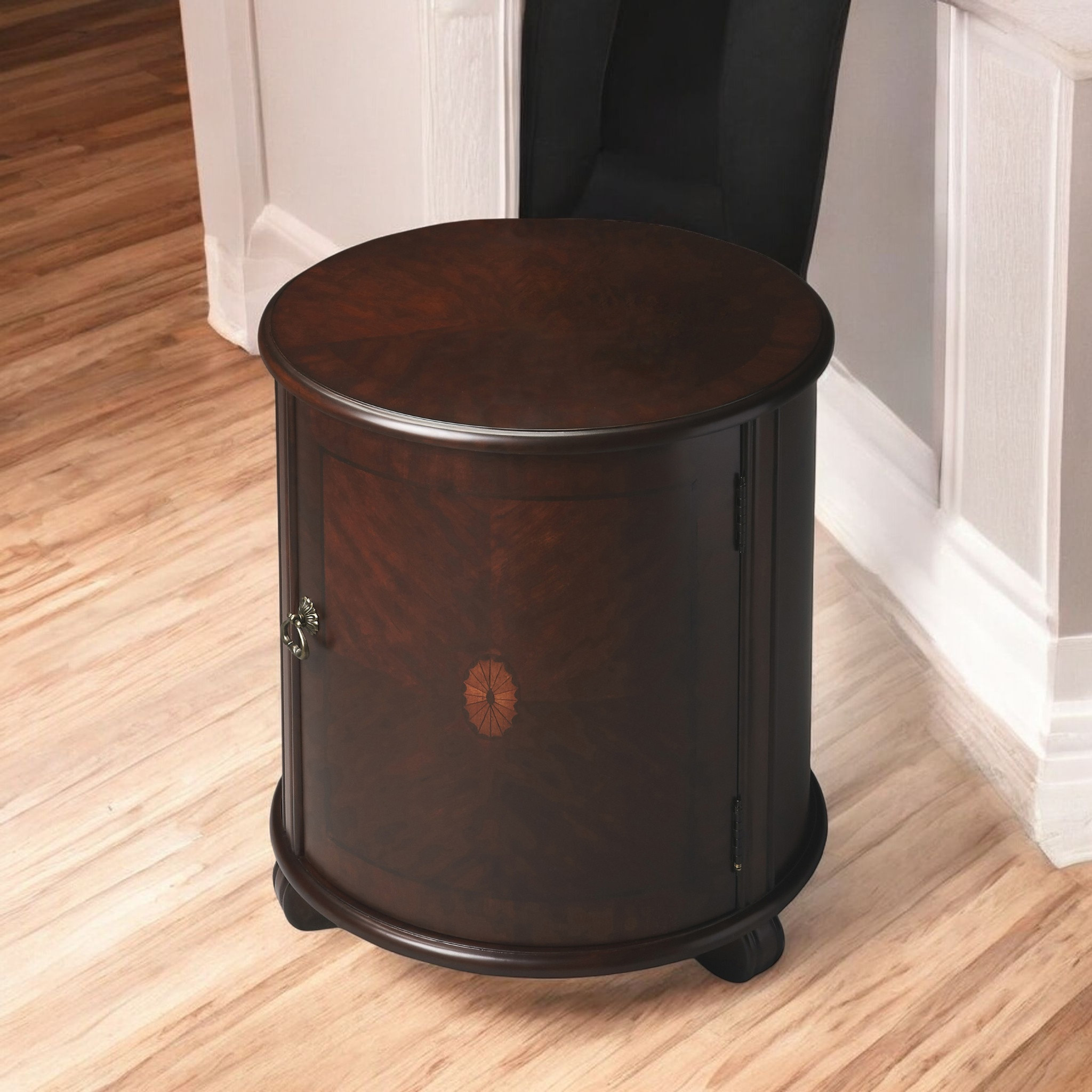 Optimize your space and add some charm to your room with the 24-inch dark brown wood round drum end table. A warm dark cherry brown coloration with the addition of an inlaid veneer design and antiqued brass colored metal accents give this piece a timeless classic and traditional look. The cabinet opens to reveal an inner shelf for storage. An ideal location for placing your snacks and drinks, and a place to keep your lamp, frames, or other accessories. 24.00-inch h x 20.00-inch w x 20.00-inch d.