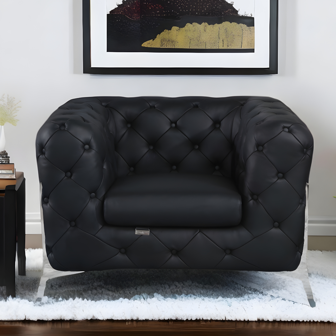This 45-inch black and silver italian leather tufted chesterfield chair will add a beautiful decorative accent to your decor. Built to last this chesterfield chair is finished in solid black italian leather to give your room a great update. The sturdy inner frame is built with high quality solid and manufactured wood, includes armrests, and features a tight back that is accented with soft and comfortable cushioning. The tufted cushions add fine designer detailing and are removable for convenience. 31-inch h x 45-inch w x 38-inch d.