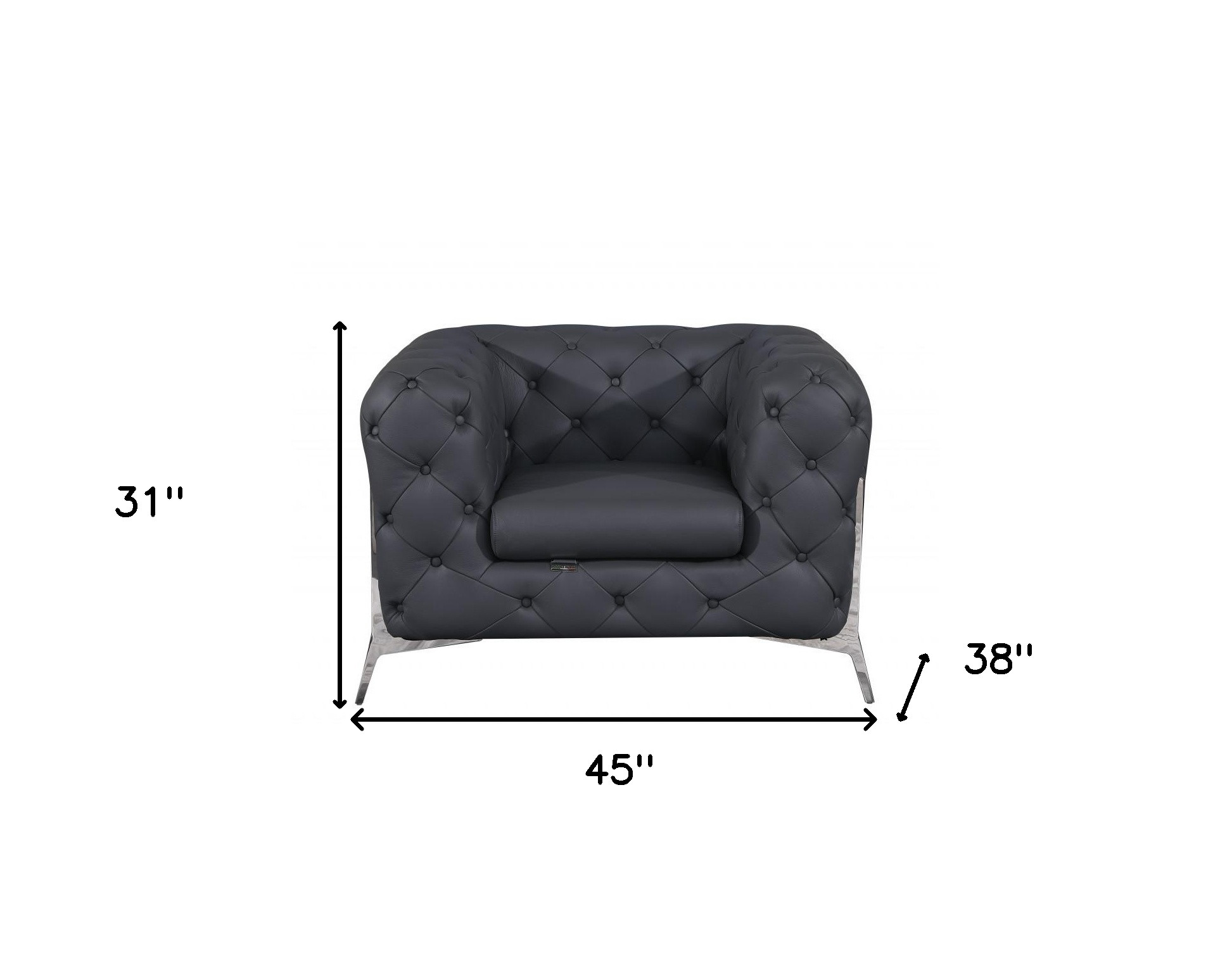 Unique and decorative, this 45-inch dark slate gray and white italian leather arm chair will leave a lasting impression. Built to last this arm chair is finished in solid dark slate gray italian leather to give your room a great update. The sturdy inner frame is built with high quality solid and manufactured wood, includes armrests, and features a tight back that is accented with soft and comfortable cushioning. 31-inch h x 45-inch w x 38-inch d.