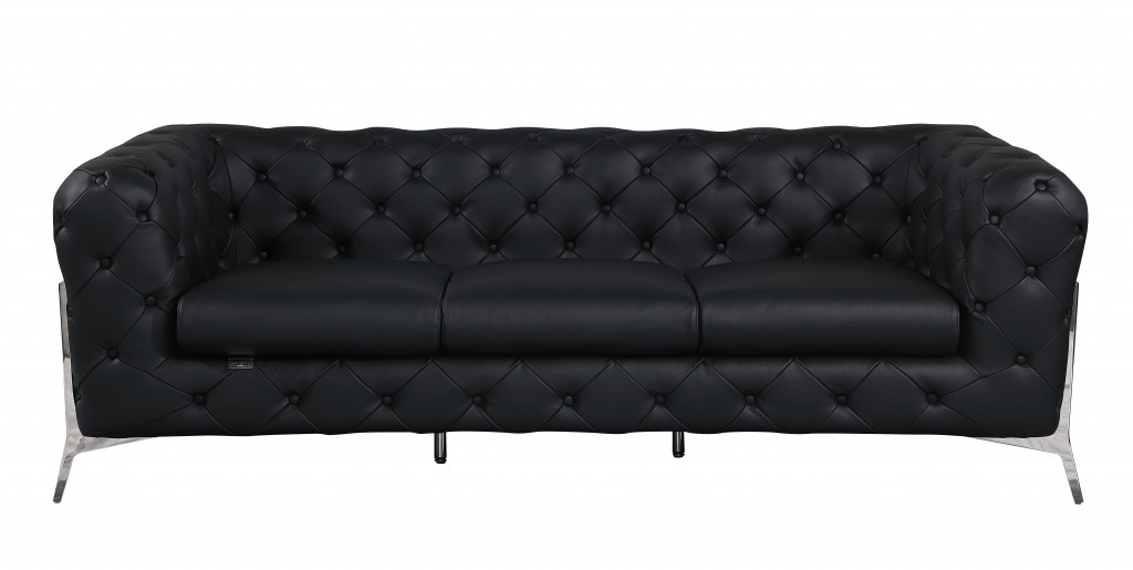 An interior designer's dream, this buttery soft high grade leather 93-inch black italian leather chesterfield sofa with silver legs will bring just the right touch to your space. The premium leather used makes your lounging luxuriously comfortable and adds an elegant appeal to your space. Solid colors give you lots of decorative options and are easy to work into your decor scheme. Web suspension construction gives this piece strong support and makes it comfortable to sit even for long periods of time. Square arms offer a comfy place to rest. Silver stainless steel legs effortlessly elevate the room and add a touch of contemporary design. Built to last, this sofa will be a great centerpiece for your room. 31-inch H x 93-inch W x 38-inch D