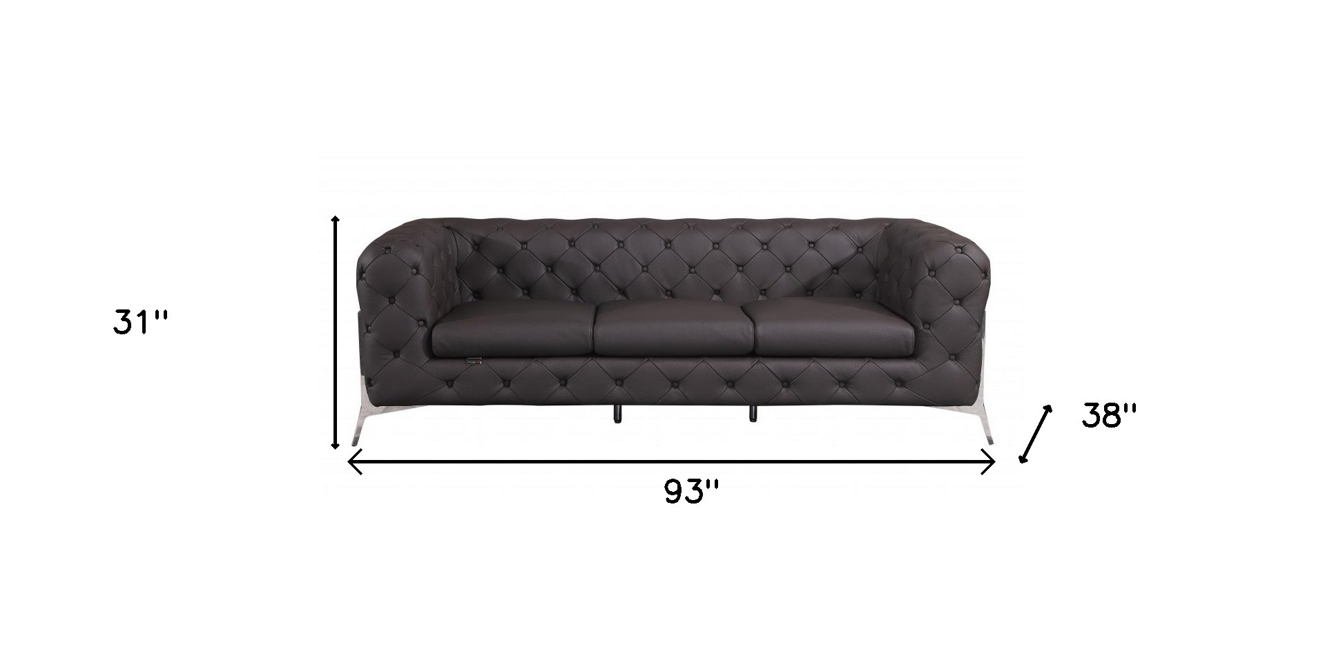 Superior construction from fabulously soft and high grade leather gives this 93-inch brown italian leather chesterfield sofa with silver legs a leg up on the competition. The premium leather used makes your lounging luxuriously comfortable and adds an elegant appeal to your space. Solid colors give you lots of decorative options and are easy to work into your decor scheme. Web suspension construction gives this piece strong support and makes it comfortable to sit even for long periods of time. Square arms offer a comfy place to rest. Silver stainless steel legs effortlessly elevate the room and add a touch of contemporary design. A great showpiece for your room, this sofa is a must have. 31-inch H x 93-inch W x 38-inch D