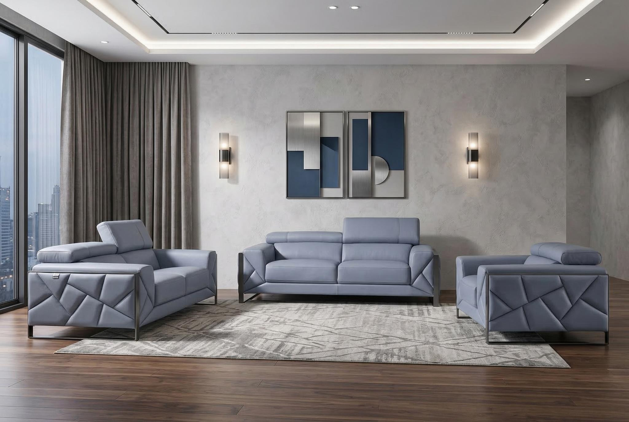 When it comes to indoor seating, this three piece indoor light blue italian leather six person seating set has everything you need to get set and ready to relax. Upholstered in supple and luxurious genuine leather, this set has a rich and warm appeal. Coil spring seat construction provides excellent comfort by offering a responsive and supportive seating experience, gently contouring to the body's natural curves. The inclusion of a loveseat into your mix allows a fashionable seating option in a compact design. Ready to re-decorate. This set is an obvious choice to fill your space with style and class. 35-inch H x 90-inch W x 42.5-inch D