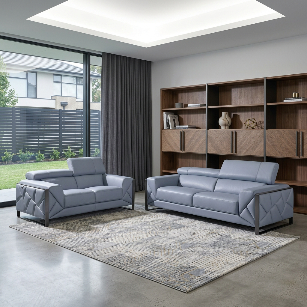 Step into a world of unparalleled seating comfort that is sure to dazzle even the toughest critic with our remarkable two piece indoor light blue italian leather five person seating set. Upholstered in supple and luxurious genuine leather, this set has a rich and warm appeal. Coil spring seat construction provides excellent comfort by offering a responsive and supportive seating experience, gently contouring to the body's natural curves. The inclusion of a loveseat into your mix allows a fashionable seating option in a compact design. Gather with family and loved ones with this seating set that will bring you all together. 35-inch H x 90-inch W x 42.5-inch D