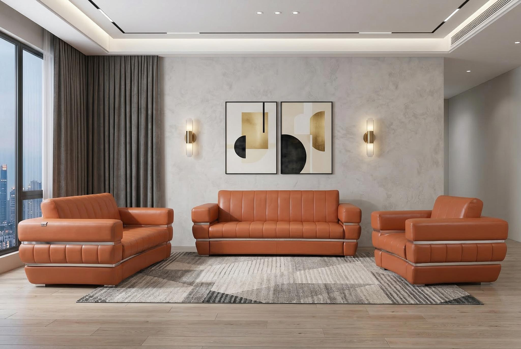 Step into a world of unparalleled seating comfort that is sure to dazzle even the toughest critic with our remarkable three piece indoor camel italian leather six person seating set. Elevate your living space with durable, comfortable, and luxurious leather upholstery. The presence of coil spring seat construction helps distribute weight evenly, reducing pressure points and enhancing overall comfort by minimizing the strain on specific areas of the body. The inclusion of a loveseat into your mix allows a fashionable seating option in a compact design. Ready to re-decorate. This set is an obvious choice to fill your space with style and class. 35-inch H x 89-inch W x 43.3-inch D