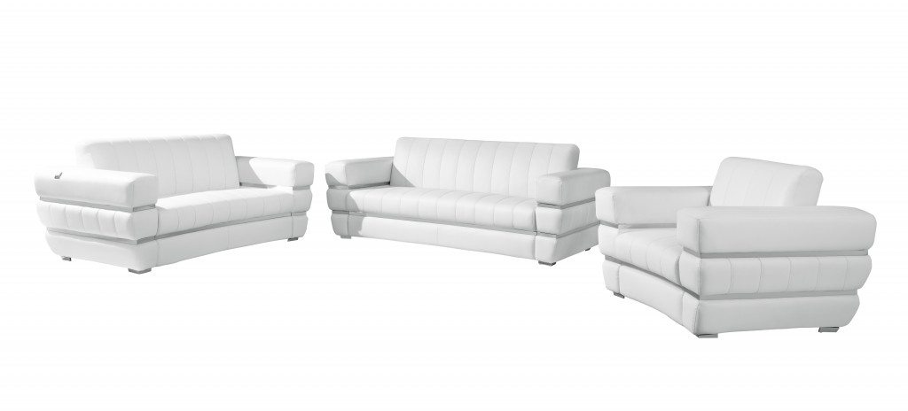 Step into a world of unparalleled seating comfort that is sure to dazzle even the toughest critic with our remarkable three piece indoor white italian leather six person seating set. Upholstered in supple and luxurious genuine leather, this set has a rich and warm appeal. The presence of coil spring seat construction helps distribute weight evenly, reducing pressure points and enhancing overall comfort by minimizing the strain on specific areas of the body. The inclusion of a loveseat into your mix allows a fashionable seating option in a compact design. Gather with family and loved ones with this seating set that will bring you all together. 35-inch H x 89-inch W x 43.3-inch D