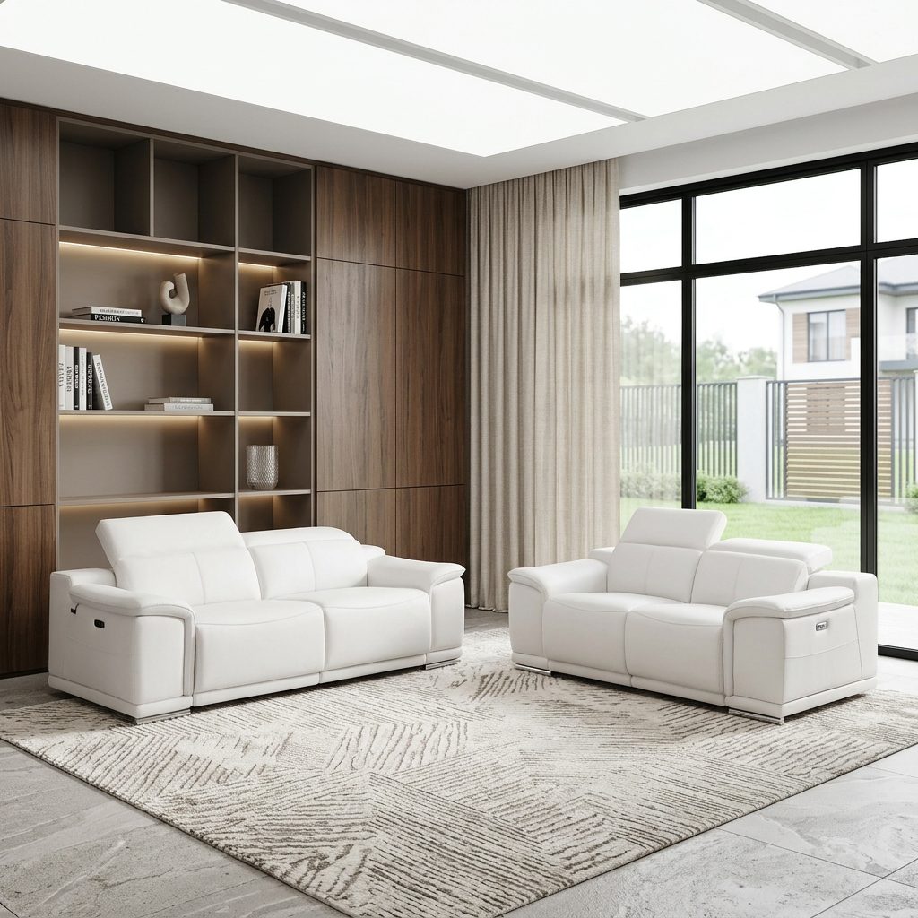 When it comes to indoor seating, this two piece indoor white italian leather five person seating set has everything you need to get set and ready to relax. Prepare to enter the realm of ultimate relaxation with this reclining sofa that offers unparalleled comfort and luxurious lounging. Upholstered in supple and luxurious genuine leather, this set has a rich and warm appeal. Coil spring seat construction provides excellent comfort by offering a responsive and supportive seating experience, gently contouring to the body's natural curves. The inclusion of a loveseat into your mix allows a fashionable seating option in a compact design. Chock full of value, this set has it all. 39.4-inch H x 85.8-inch W x 42.3-inch D
