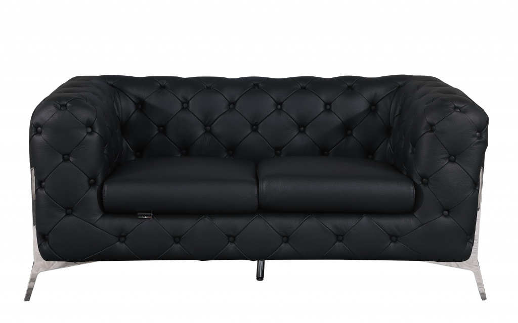 Prepare to amaze even the most discerning critics with our two piece indoor black italian leather five person seating set - the epitome of indoor seating that will leave them speechless. Elevate your living space with durable, comfortable, and luxurious leather upholstery. The presence of coil spring seat construction helps distribute weight evenly, reducing pressure points and enhancing overall comfort by minimizing the strain on specific areas of the body. Tufted cushioning provides a visually appealing texture and pattern on the cushions, adding a touch of elegance and sophistication to your furniture. The inclusion of a loveseat into your mix allows a fashionable seating option in a compact design. Gather with family and loved ones with this seating set that will bring you all together. 30.5-inch H x 93-inch W x 38-inch D