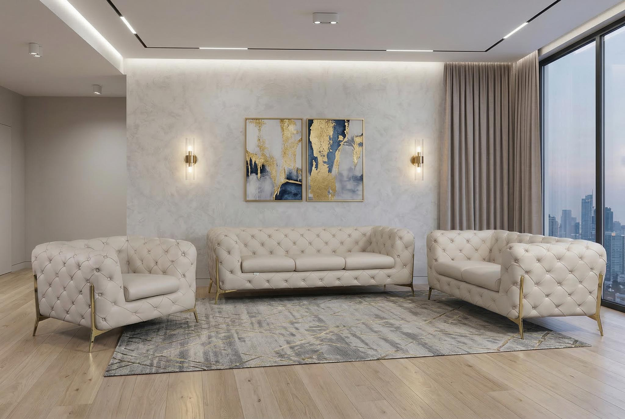 Prepare to amaze even the most discerning critics with our three piece indoor beige italian leather six person seating set - the epitome of indoor seating that will leave them speechless. Upholstered in supple and luxurious genuine leather, this set has a rich and warm appeal. The presence of coil spring seat construction helps distribute weight evenly, reducing pressure points and enhancing overall comfort by minimizing the strain on specific areas of the body. Tufted cushioning provides a visually appealing texture and pattern on the cushions, adding a touch of elegance and sophistication to your furniture. The inclusion of a loveseat into your mix allows a fashionable seating option in a compact design. Chock full of value, this set has it all. 44-inch H x 90-inch W x 40-inch D
