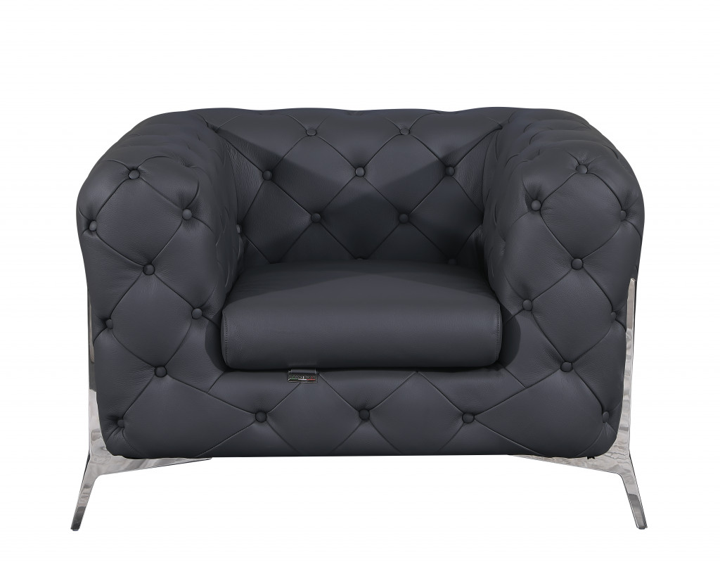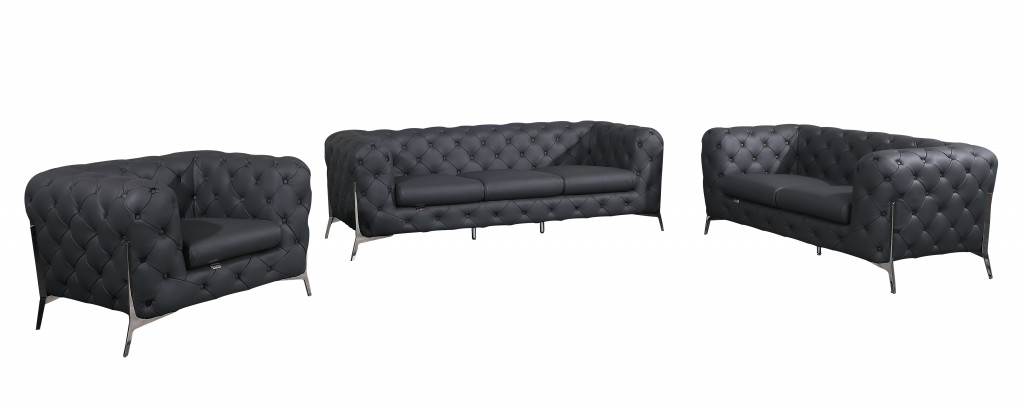 When it comes to indoor seating, this three piece indoor dark gray italian leather six person seating set has everything you need to get set and ready to relax. Upholstered in supple and luxurious genuine leather, this set has a rich and warm appeal. Coil spring seat construction provides excellent comfort by offering a responsive and supportive seating experience, gently contouring to the body's natural curves. Tufted cushioning provides a visually appealing texture and pattern on the cushions, adding a touch of elegance and sophistication to your furniture. The inclusion of a loveseat into your mix allows a fashionable seating option in a compact design. Chock full of value, this set has it all. 44-inch H x 90-inch W x 40-inch D