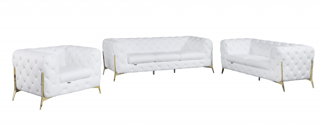 Step into a world of unparalleled seating comfort that is sure to dazzle even the toughest critic with our remarkable three piece indoor white italian leather six person seating set. Upholstered in supple and luxurious genuine leather, this set has a rich and warm appeal. Coil spring seat construction provides excellent comfort by offering a responsive and supportive seating experience, gently contouring to the body's natural curves. Tufted cushioning provides a visually appealing texture and pattern on the cushions, adding a touch of elegance and sophistication to your furniture. The inclusion of a loveseat into your mix allows a fashionable seating option in a compact design. Chock full of value, this set has it all. 44-inch H x 90-inch W x 40-inch D