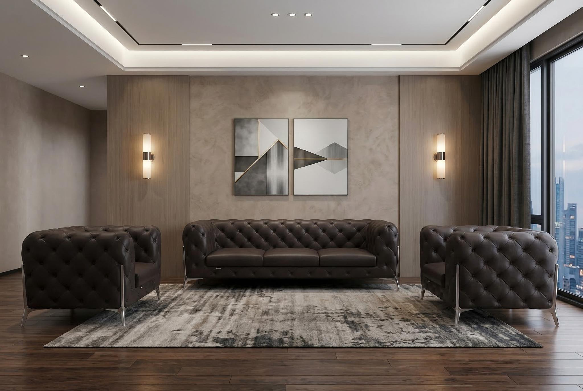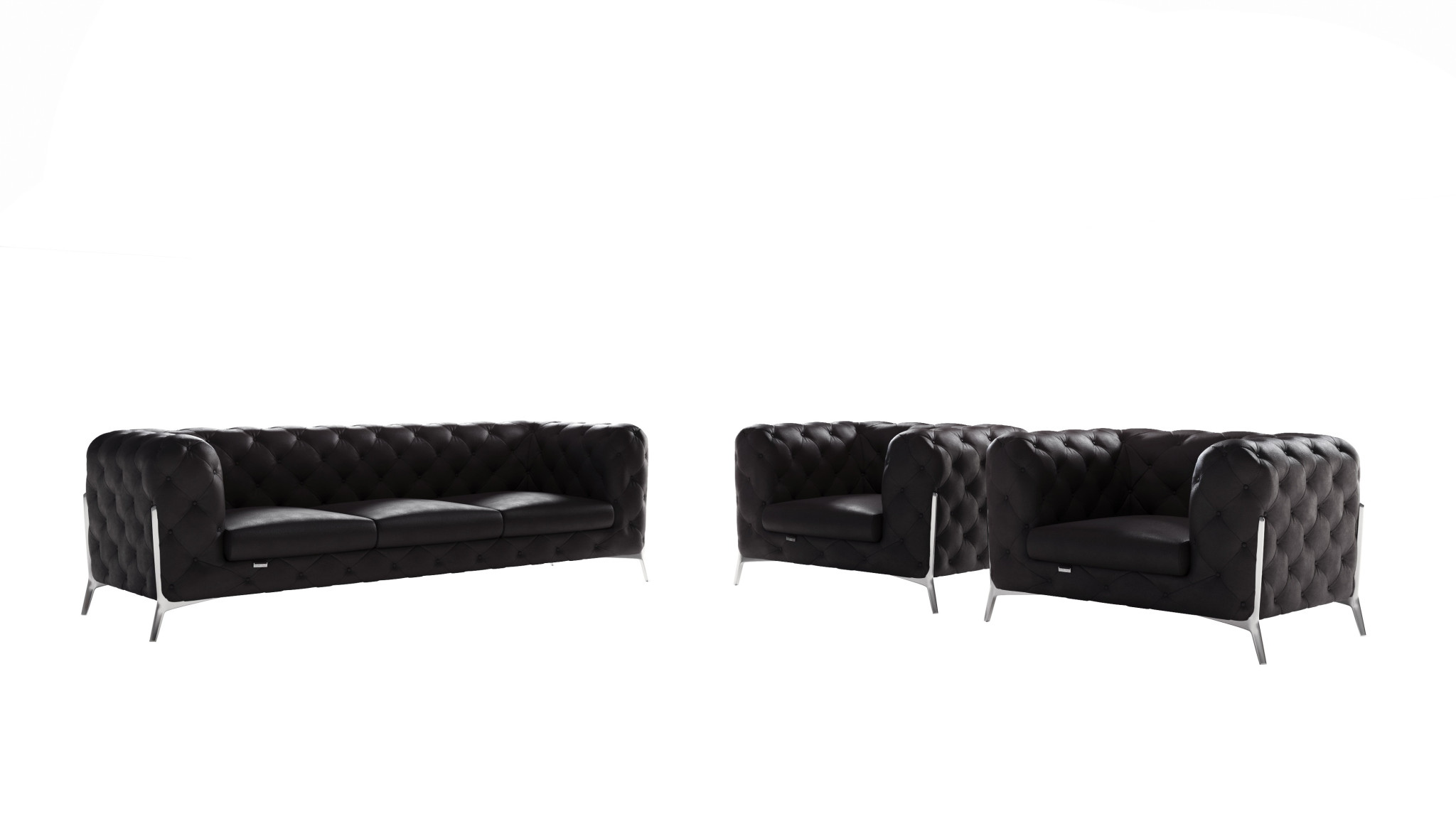 When it comes to indoor seating, this three piece indoor black italian leather five person seating set has everything you need to get set and ready to relax. Upholstered in supple and luxurious genuine leather, this set has a rich and warm appeal. Coil spring seat construction provides excellent comfort by offering a responsive and supportive seating experience, gently contouring to the body's natural curves. Tufted cushioning provides a visually appealing texture and pattern on the cushions, adding a touch of elegance and sophistication to your furniture. Chock full of value, this set has it all. 30.5-inch H x 93-inch W x 38-inch D