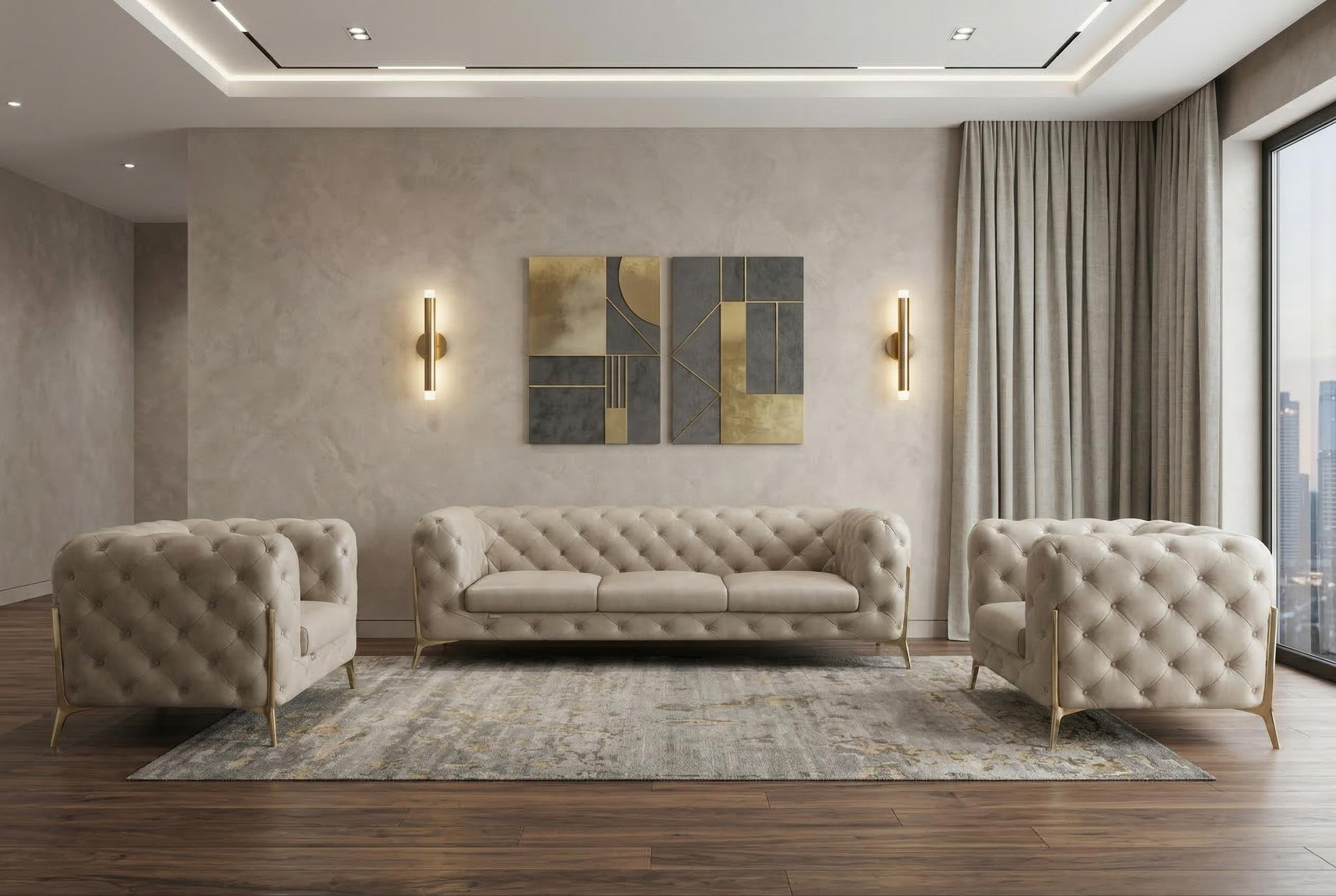 When it comes to indoor seating, this three piece indoor beige italian leather five person seating set has everything you need to get set and ready to relax. Upholstered in supple and luxurious genuine leather, this set has a rich and warm appeal. The presence of coil spring seat construction helps distribute weight evenly, reducing pressure points and enhancing overall comfort by minimizing the strain on specific areas of the body. Tufted cushioning provides a visually appealing texture and pattern on the cushions, adding a touch of elegance and sophistication to your furniture. Gather with family and loved ones with this seating set that will bring you all together. 30.5-inch H x 93-inch W x 38-inch D