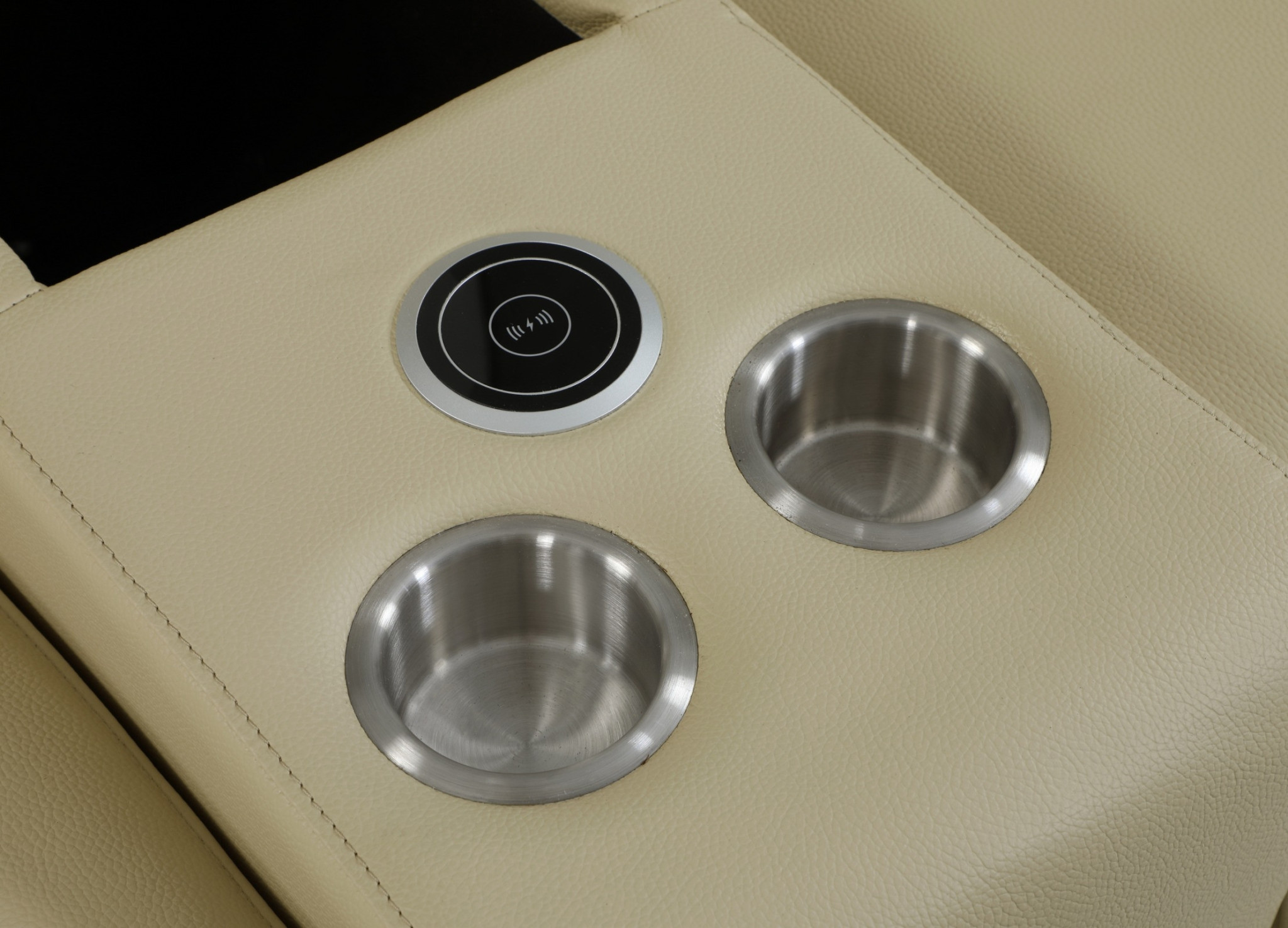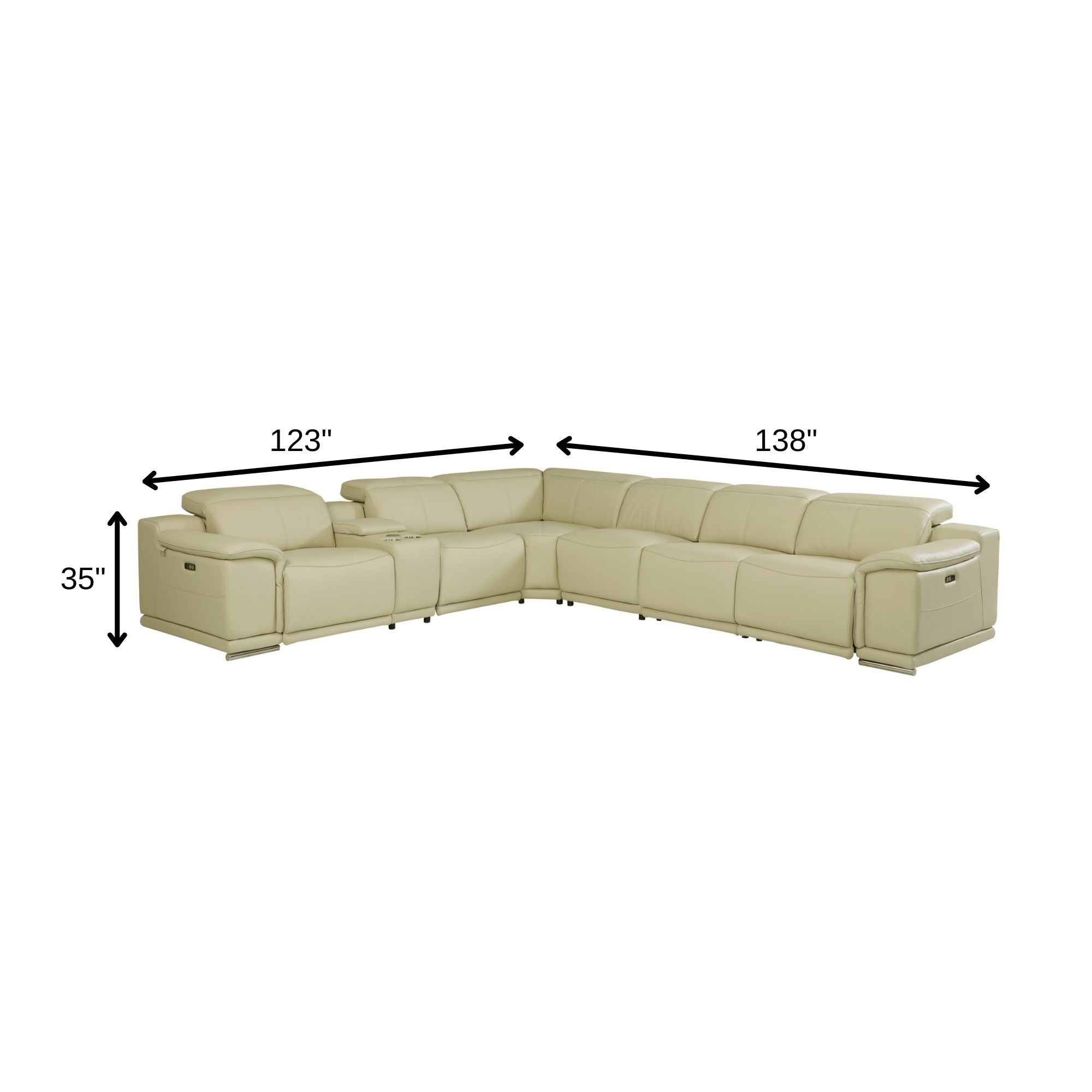 Take your relaxation to the next level with this super soft and comfortable beige italian leather power reclining u shaped seven piece corner sectional with console. The high-end premium leather used makes your lounging luxuriously comfortable and adds an elegant appeal to your space. Solid colors give you lots of decorative options and are easy to work into your decor scheme. Square arms offer a comfy place to rest. For the ultimate in relaxation, this sectional includes power - push button recline that turns it into a comfy lounge for sleeping or resting. Silver metal legs effortlessly elevate the room and add a touch of contemporary design. Features console storage for convenience and to help keep your space tidy. A great showpiece for your room, this sectional is a must have. 35-inch H x 123-inch W x 138-inch D