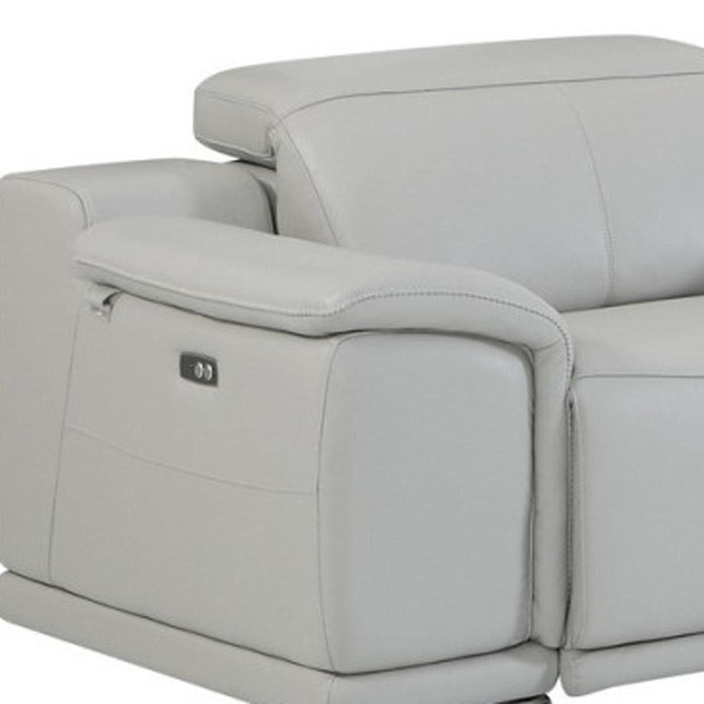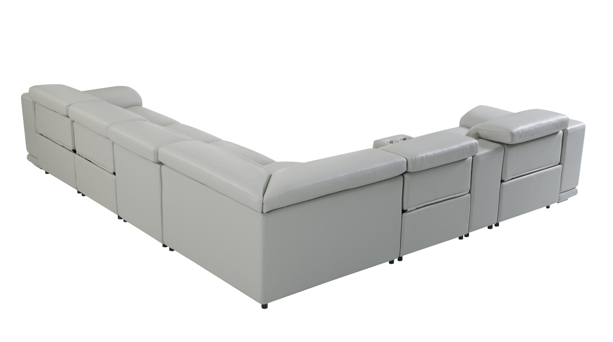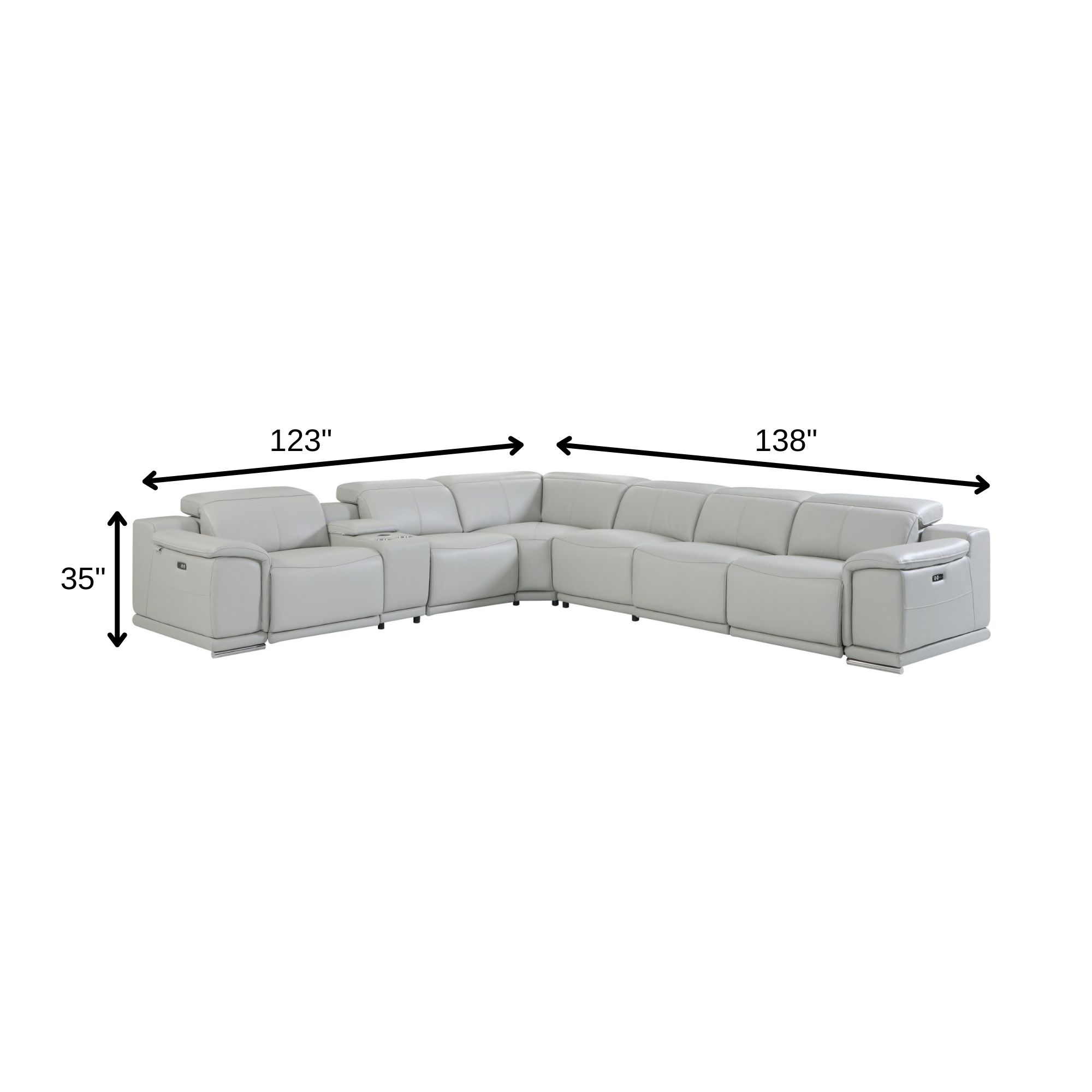 Take your relaxation to the next level with this super soft and comfortable light gray italian leather power reclining u shaped seven piece corner sectional with console. The high-end premium leather used makes your lounging luxuriously comfortable and adds an elegant appeal to your space. Solid colors give you lots of decorative options and are easy to work into your decor scheme. Square arms offer a comfy place to rest. Power - push button recline allows you to truly rest, lounge and even sleep comfortably. Silver metal legs effortlessly elevate the room and add a touch of contemporary design. Features console storage for convenience and to help keep your space tidy. A great showpiece for your room, this sectional is a must have. 35-inch H x 123-inch W x 138-inch D