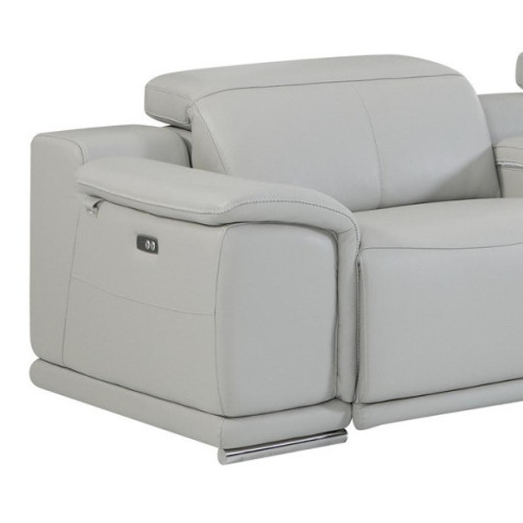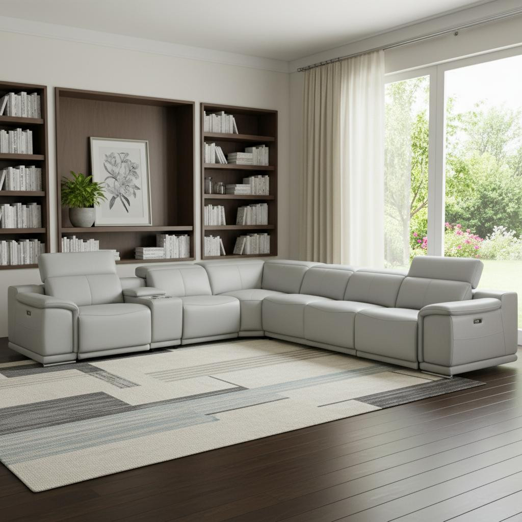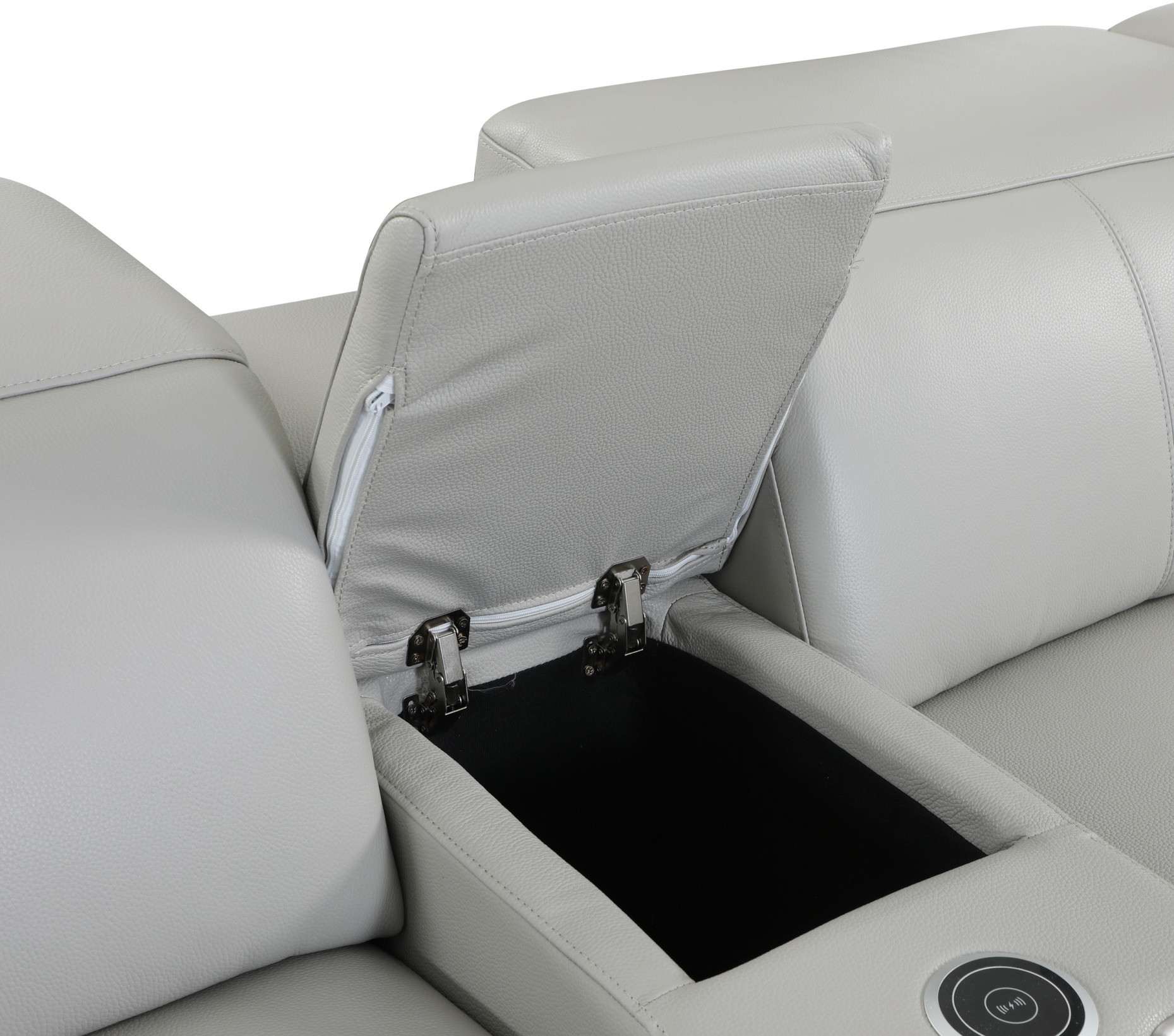 Take your relaxation to the next level with this super soft and comfortable light gray italian leather power reclining u shaped seven piece corner sectional with console. The high-end premium leather used makes your lounging luxuriously comfortable and adds an elegant appeal to your space. Solid colors give you lots of decorative options and are easy to work into your decor scheme. Square arms offer a comfy place to rest. Power - push button recline allows you to truly rest, lounge and even sleep comfortably. Silver metal legs effortlessly elevate the room and add a touch of contemporary design. Features console storage for convenience and to help keep your space tidy. A great showpiece for your room, this sectional is a must have. 35-inch H x 123-inch W x 138-inch D