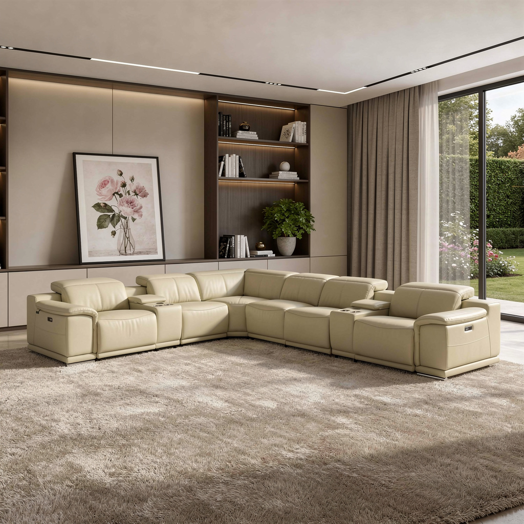 Superior construction from fabulously soft and high-grade leather gives this beige italian leather power reclining u shaped eight piece corner sectional with console a leg up on the competition. The premium leather used makes your lounging luxuriously comfortable and adds an elegant appeal to your space. Solid colors give you lots of decorative options and are easy to work into your decor scheme. Square arms offer a comfy place to rest. Power - push button recline allows you to truly rest, lounge and even sleep comfortably. Silver metal legs effortlessly elevate the room and add a touch of contemporary design. Features console storage for convenience and to help keep your space tidy. A great showpiece for your room, this sectional is a must have. 35-inch H x 123-inch W x 138-inch D
