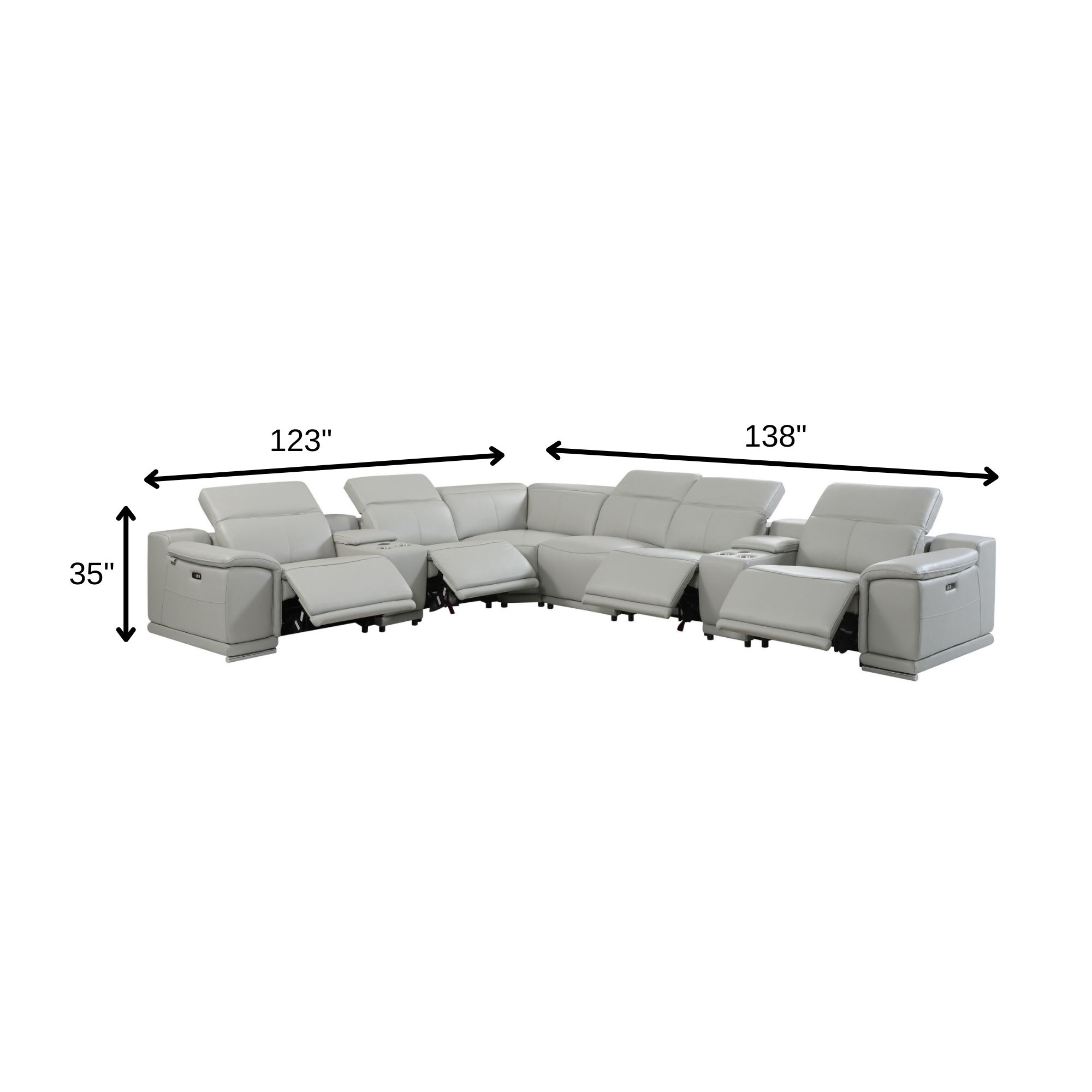 Made of the highest quality, supple leather, this light gray italian leather power reclining u shaped eight piece corner sectional with console will be the star of your space. The high-grade premium leather used makes your lounging luxuriously comfortable and adds an elegant appeal to your space. Solid colors give you lots of decorative options and are easy to work into your decor scheme. Square arms offer a comfy place to rest. Power - push button recline allows you to truly rest, lounge and even sleep comfortably. Silver metal legs effortlessly elevate the room and add a touch of contemporary design. Features console storage for convenience and to help keep your space tidy. A great showpiece for your room, this sectional is a must have. 35-inch H x 123-inch W x 138-inch D
