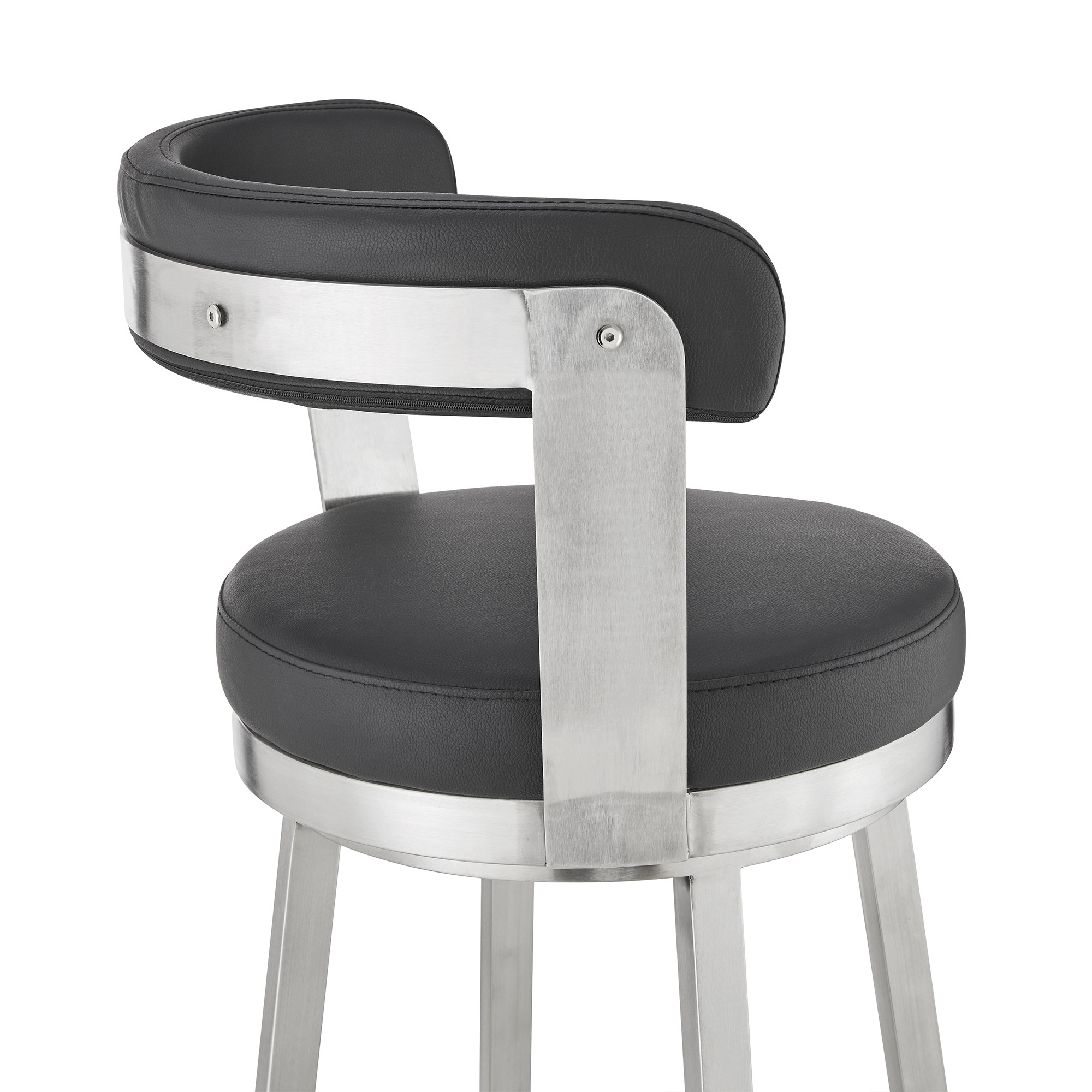 The perfect way to add some extra seating in your home, this 30-inch black and silver iron swivel backless bar height bar chair with footrest will elevate the look and vibe of your room. A silver iron frame is finished off with a black fabric seat that is the epitome of quality construction and design. The round shape of the seat give this backless chair a fresh and fashionable look. Designed with a footrest for comfort and convenience. 40-inch H x 21-inch W x 19-inch D