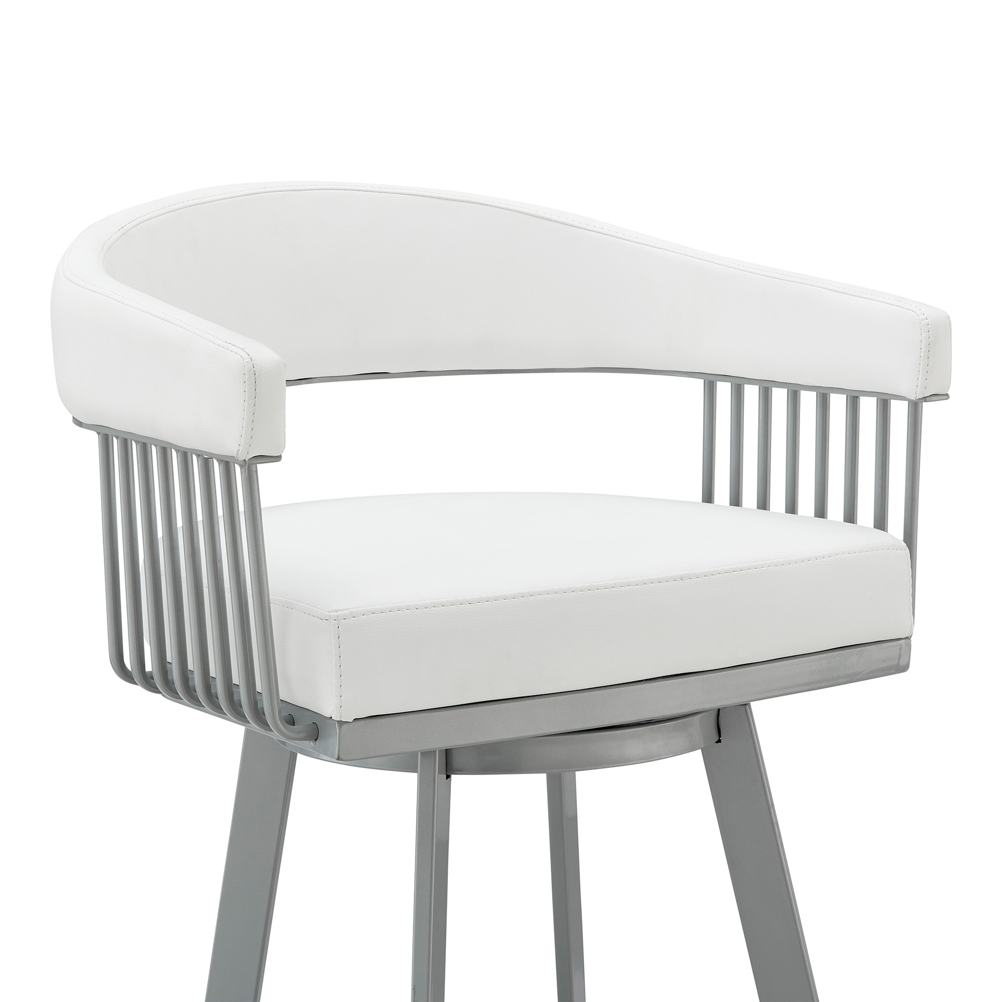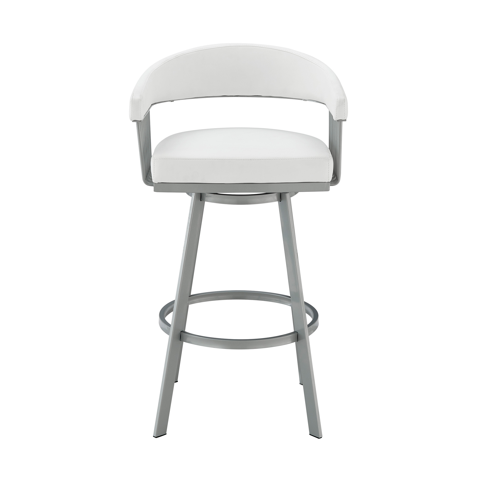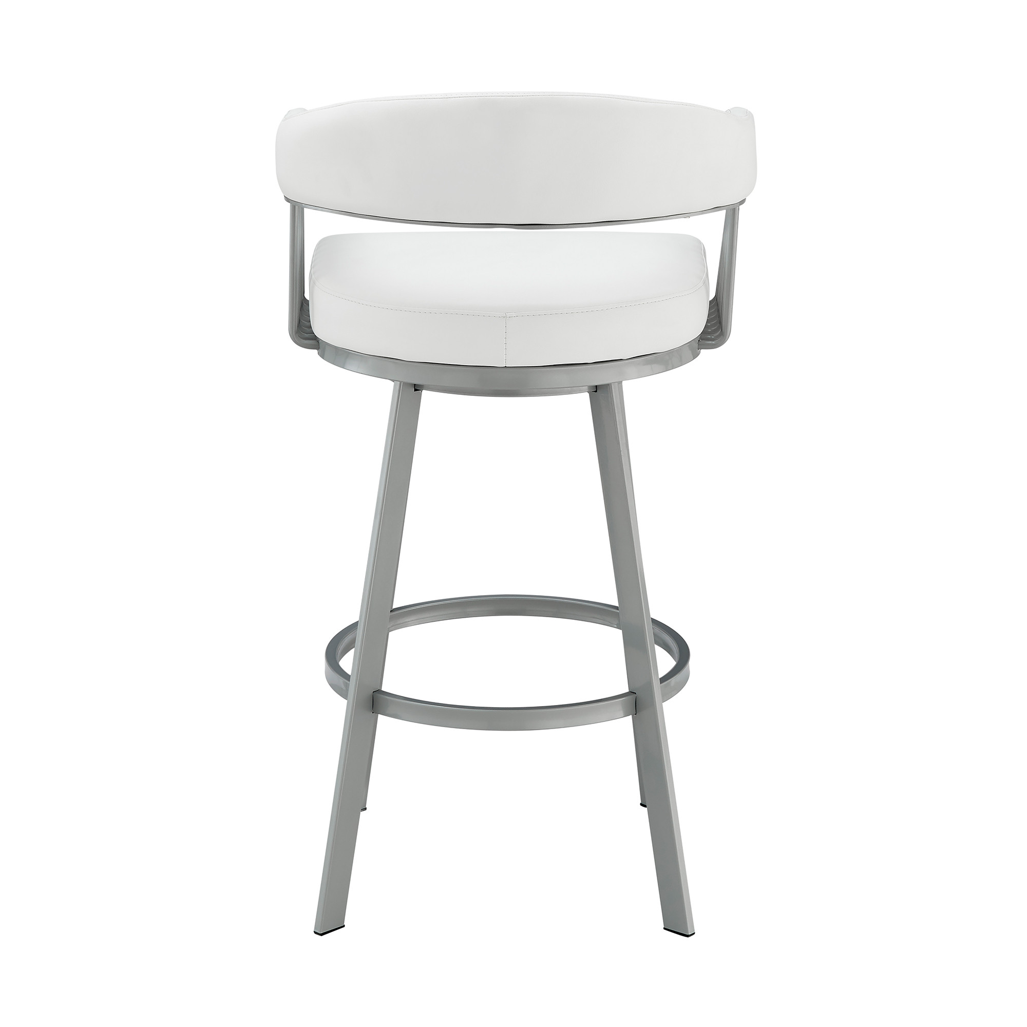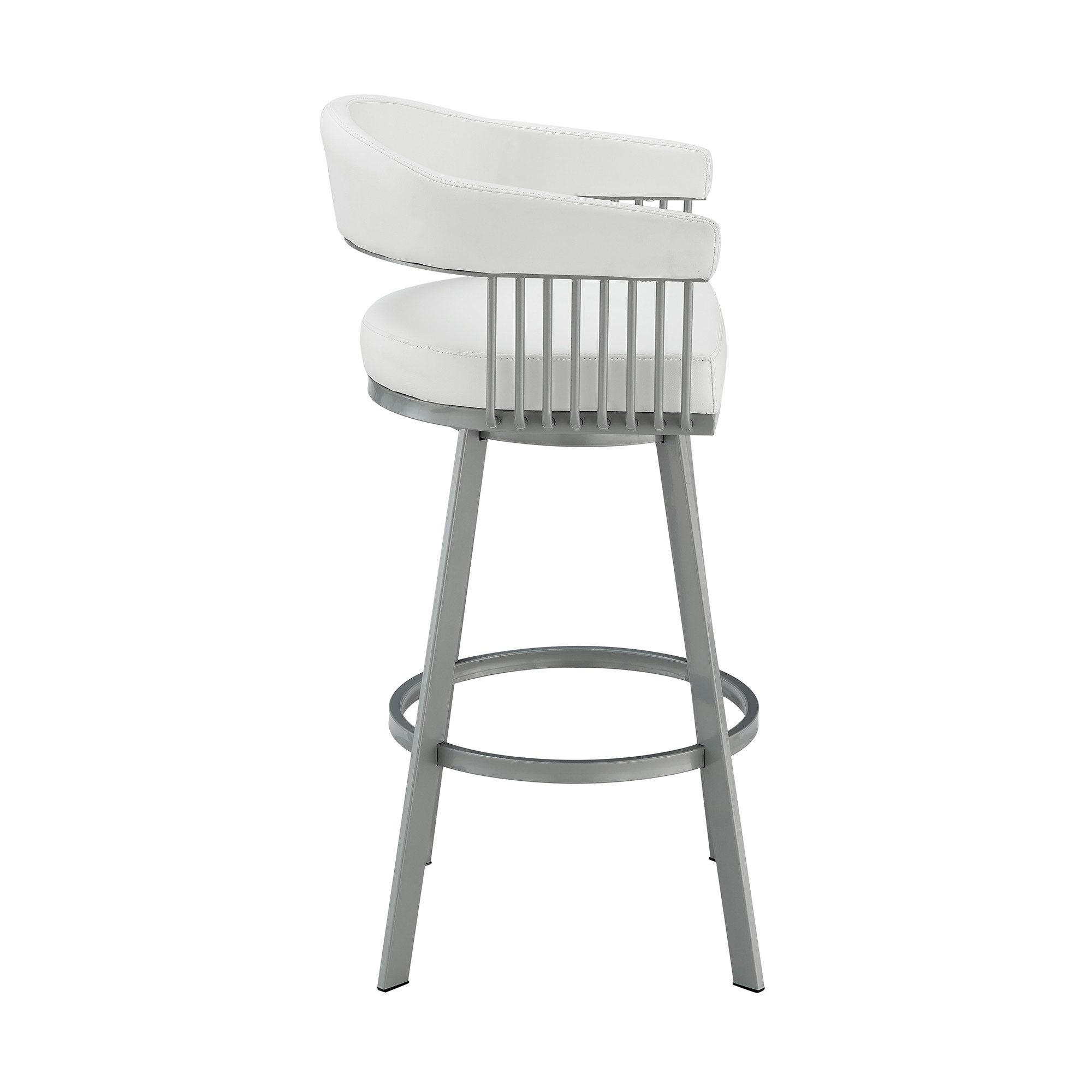 With this 25-inch white and silver iron swivel backless counter height bar chair with footrest you can add design and extra seating to your space. The base of this stool is made from iron in a silver color that is a nice contrast to the white fabric seat. Designed to be good looking and practical, this backless bar chair features a round shaped seat. Designed with armrests for your comfort, this chair also features a footrest for comfort and convenience. 34-inch H x 22-inch W x 21-inch D
