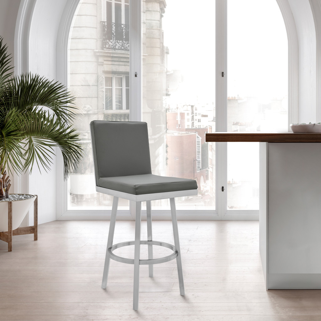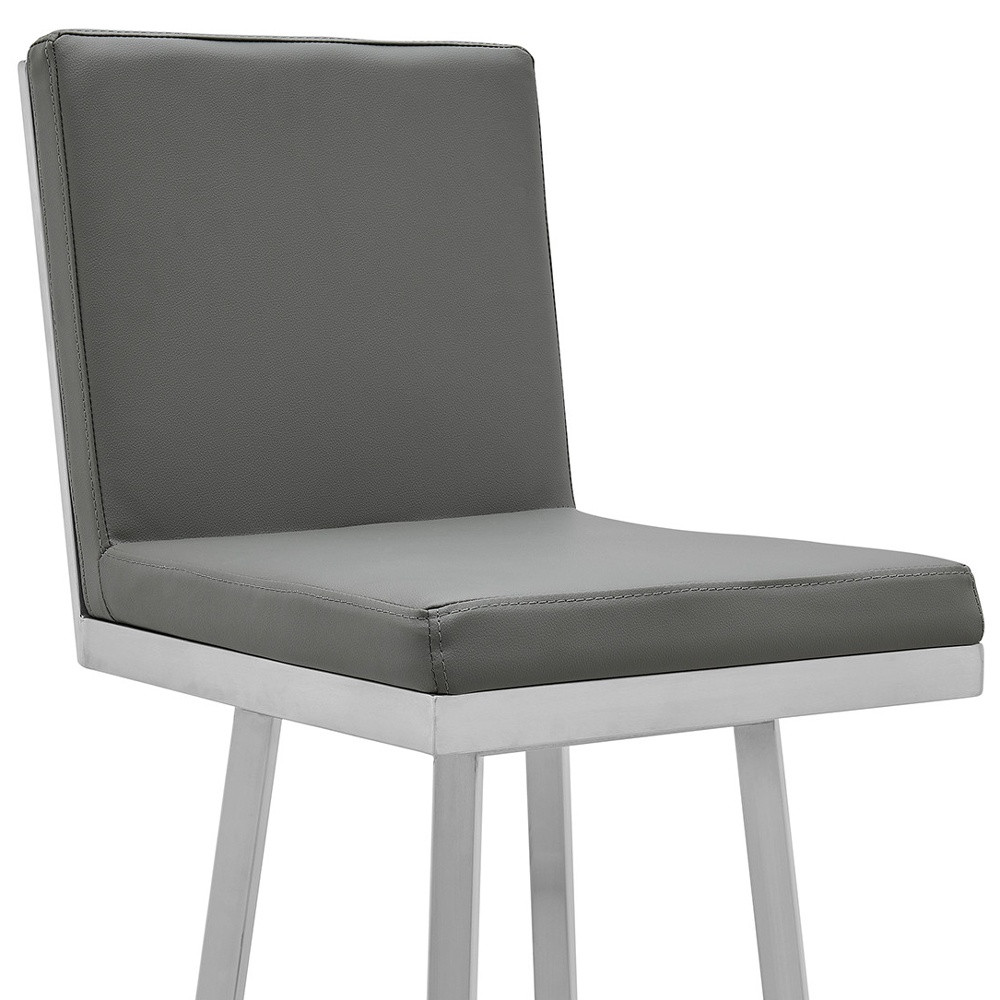 This 30-inch gray and silver faux leather and iron swivel bar height bar chair with footrest will be the perfect way to add some cool design and utility to your space similar to what you find in your favorite cafes or pubs. The silver coloration of the high quality iron base marries nicely with the gray faux leather seat. The round shape of the seat combines with a full back to give this chair a comfortable and fashionable look. Designed with a footrest for comfort and convenience. 44-inch H x 19-inch W x 23-inch D