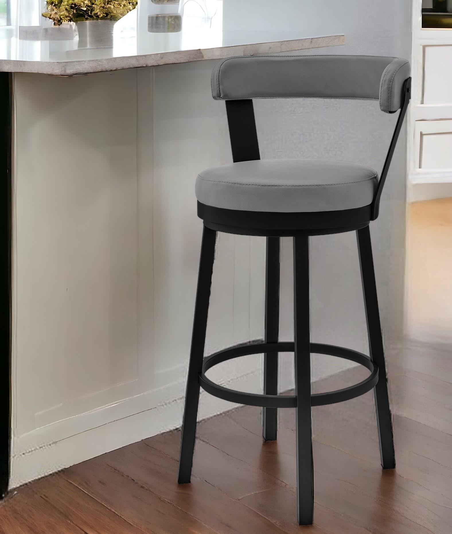 Comfort and design come together nicely in this 26-inch gray and black fabric and iron counter height swivel bar chair. The base of this stool is made from iron in a black color that is a nice contrast to the gray fabric seat. A full_back mixed with a round shaped seat design makes this chair both comfortable and fashionable. Designed with a footrest for comfort and convenience. 36-inch h x 17-inch w x 19-inch d.