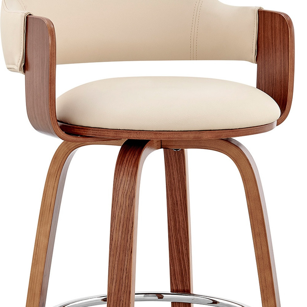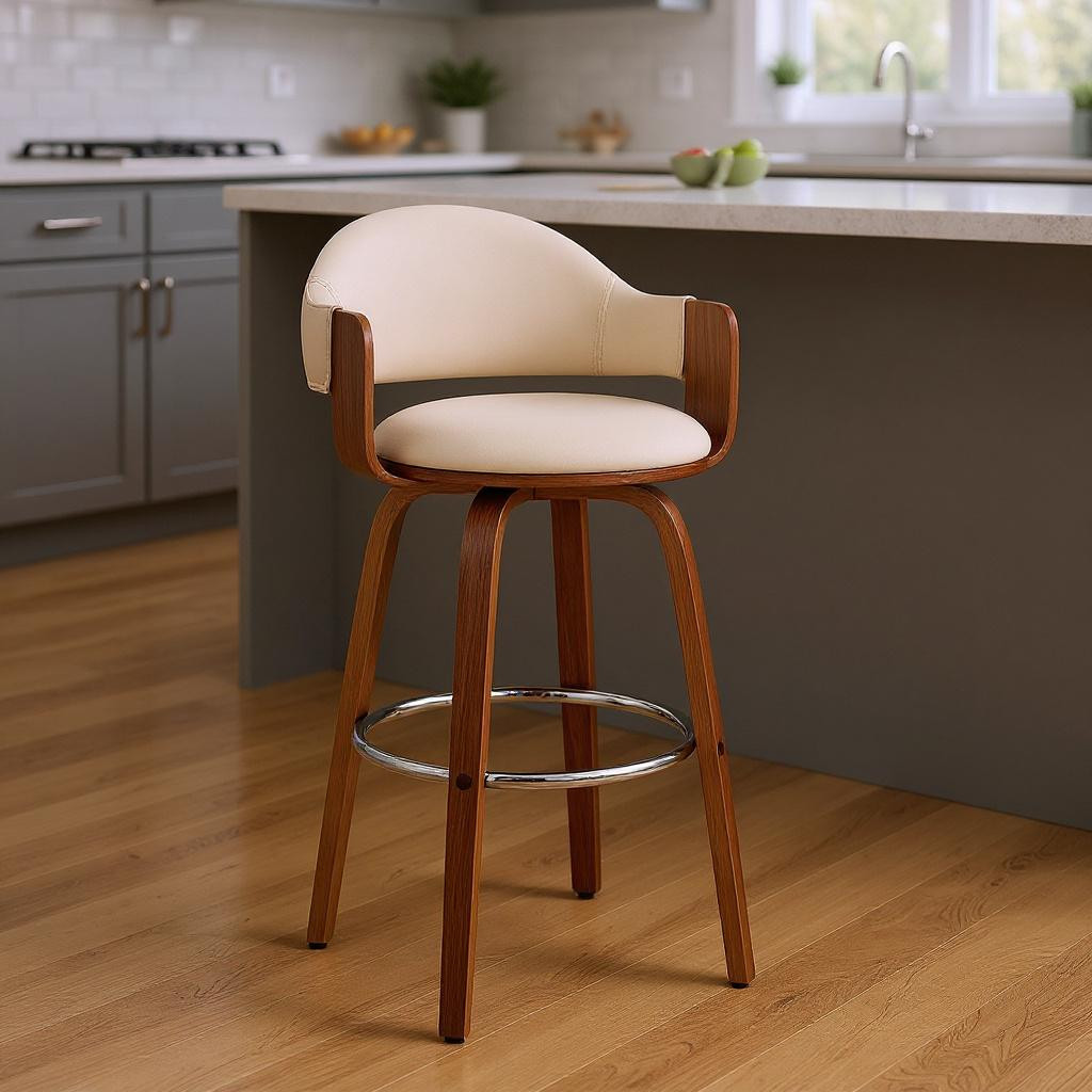 Set up your home with some next-level stylish design with this 26" Rich Cream Faux Leather Bar Stool with Walnut Wood. The stool live up to its name as it is adorned in rich faux leather that is perfectly contrasted by its walnut wood frame that runs down to the base to provide a very strong support for the entire stool structure so you can conveniently sit knowing that the stool can and will hold your weight. The seat is cushioned and well padded with high-density foam that provides enough comfort. The metal footrest sits perfectly between the wooden legs and that only shows how the different elements featured in this chair combine well to make it a masterpiece. Its 360-degrees swivel function can make you turn to any direction with ease. 36 x 20 x 20