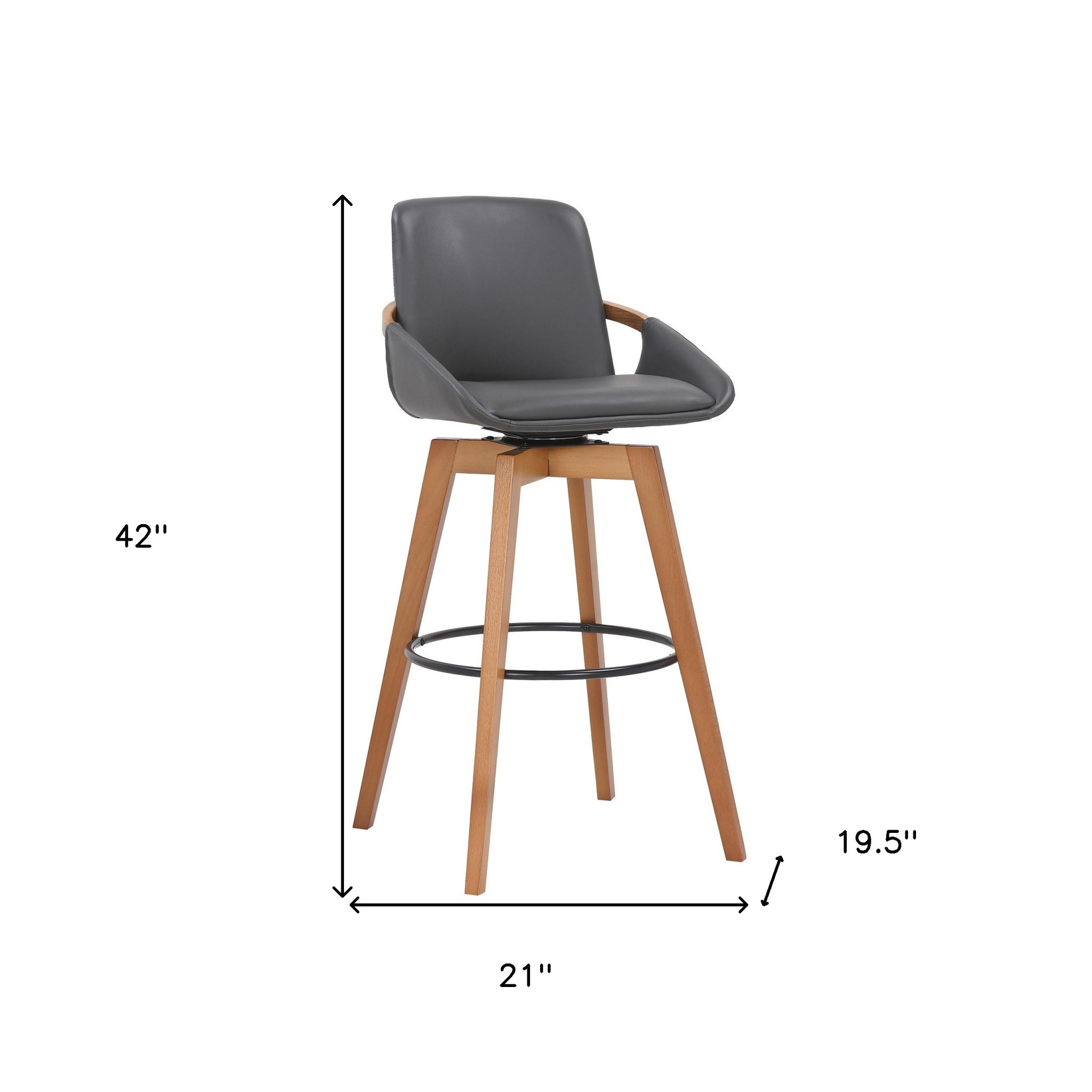 Finding the right stool can be daunting, but this 30" Luxurious Grey Faux and Walnut Wood Swivel Bar Stool might be exactly what you need in your space to give it the lift it deserves. Its 360-degree swivel effect that increases mobility for an amazing experience means you won't miss out on comfort even when you have one of the most beautiful stool designs at your disposal. Unlike other stools that have metal frames, this stool comes with a wooden frame that runs from the back of the seat to the base, which creates a beautiful contrast to the soft grey faux leather upholstery the stool is adorned in. To make you enjoy longer relaxation period, there's a ring footrest close to the base of the stool and it gives you the stability you deserve while you're seated. 42" x 19.5" x 21"