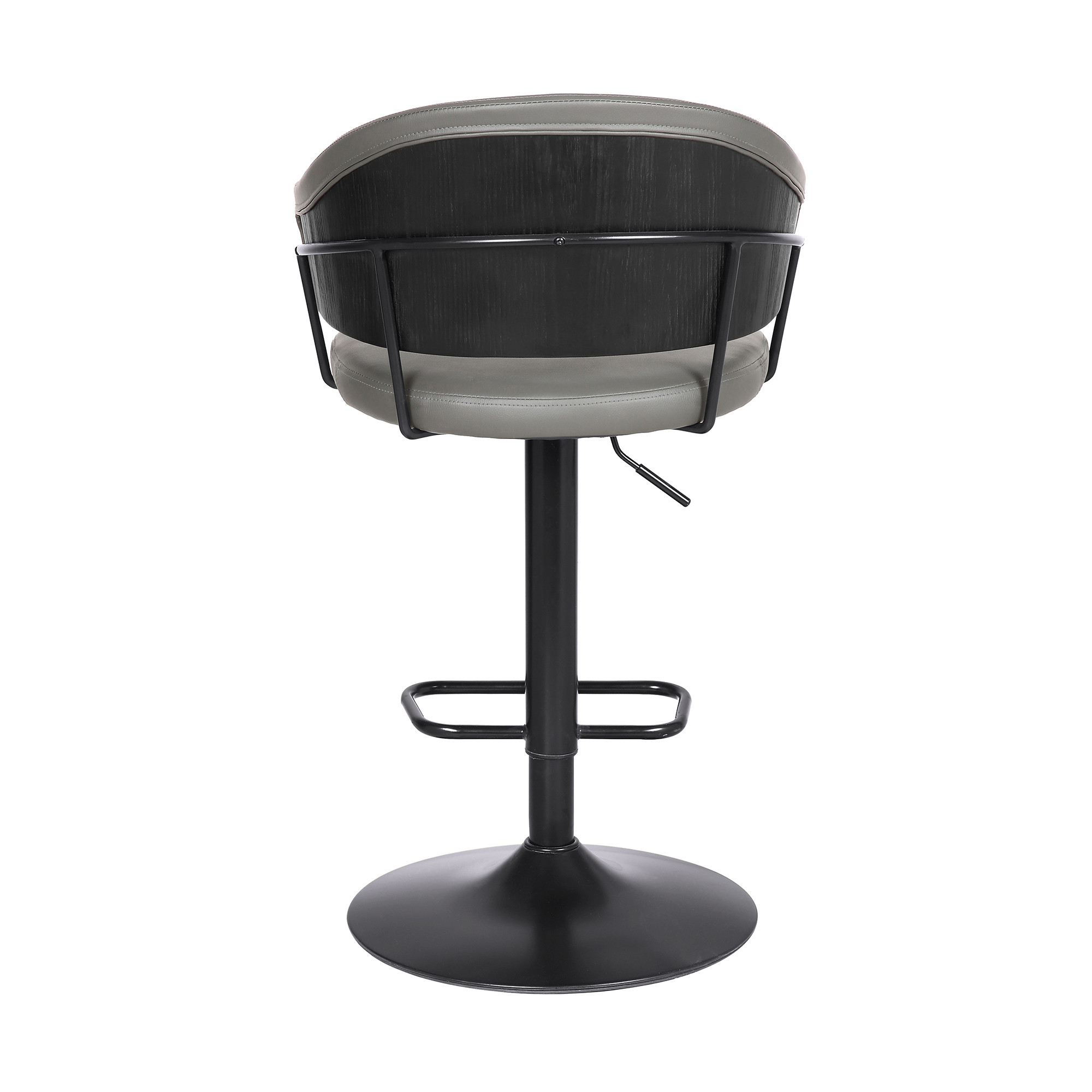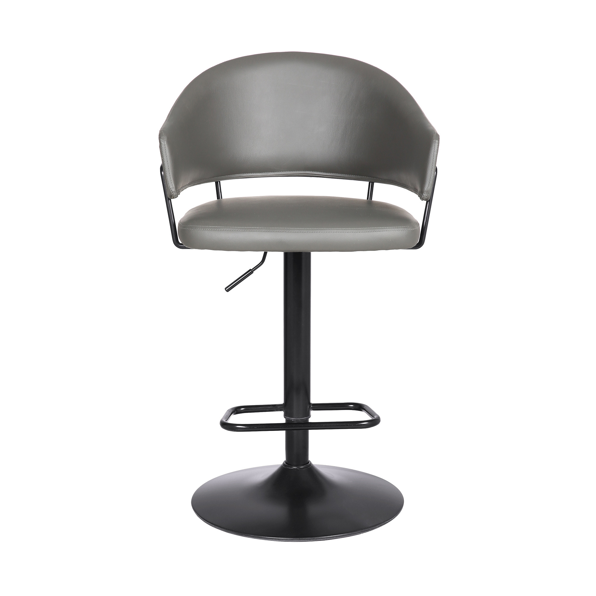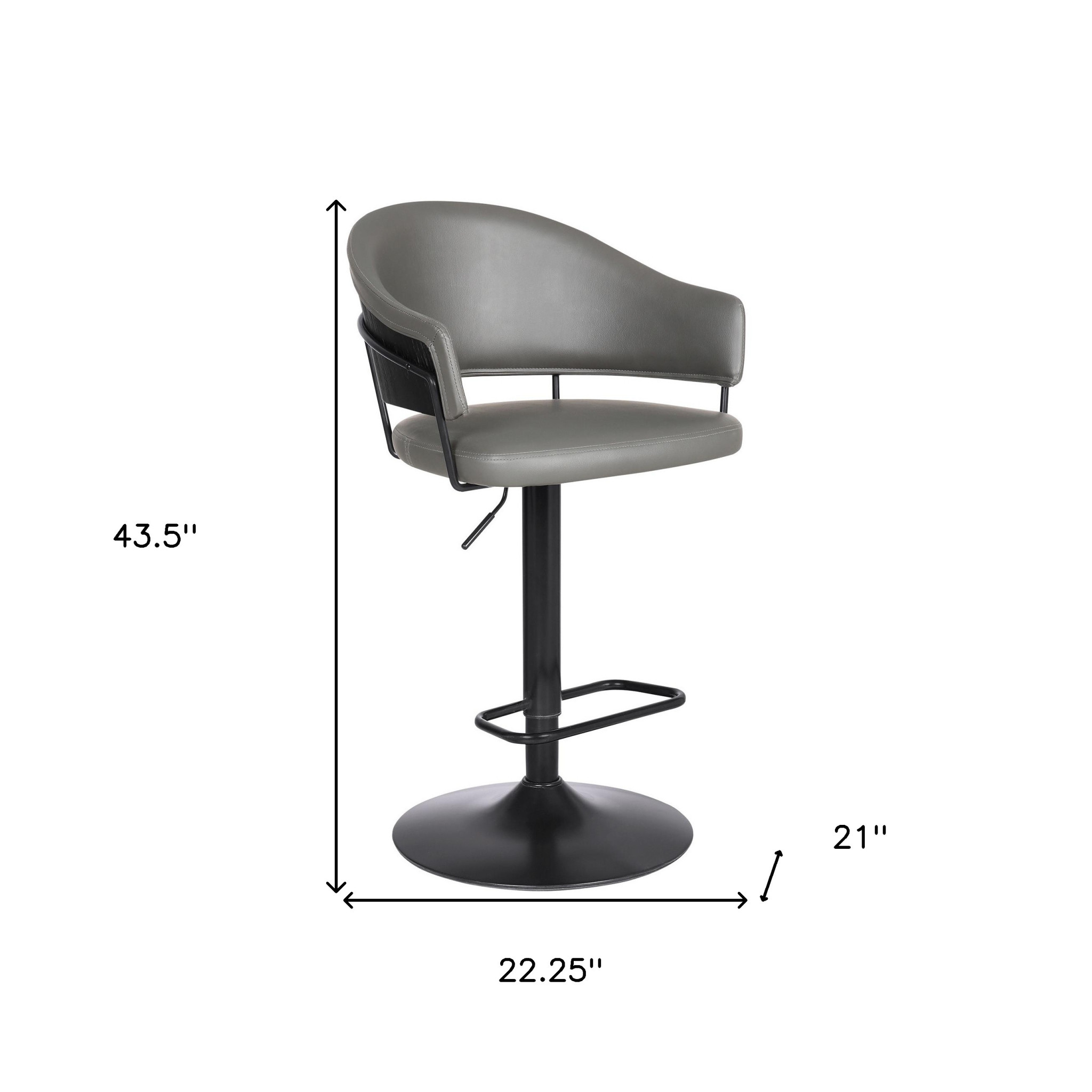 This glamorous Adjustable Grey Faux Leather Black Wood and Metal Bar Stool will give you the perfect combination of style and functionality. The eye-catching silhouette is a great point of interest with the opening between the seat and back that is not only comortable but a decorative and attractive design element. The mixture of black wood accents and metal for the base and arms creates the perfect contrast for the soft and sturdy grey faux leather. Apart from being an adjustable stool that can be set to your preferred height, you can also enjoy the full 360-degree swivel function for full mobility. 43.5" x 21" x 22.25"