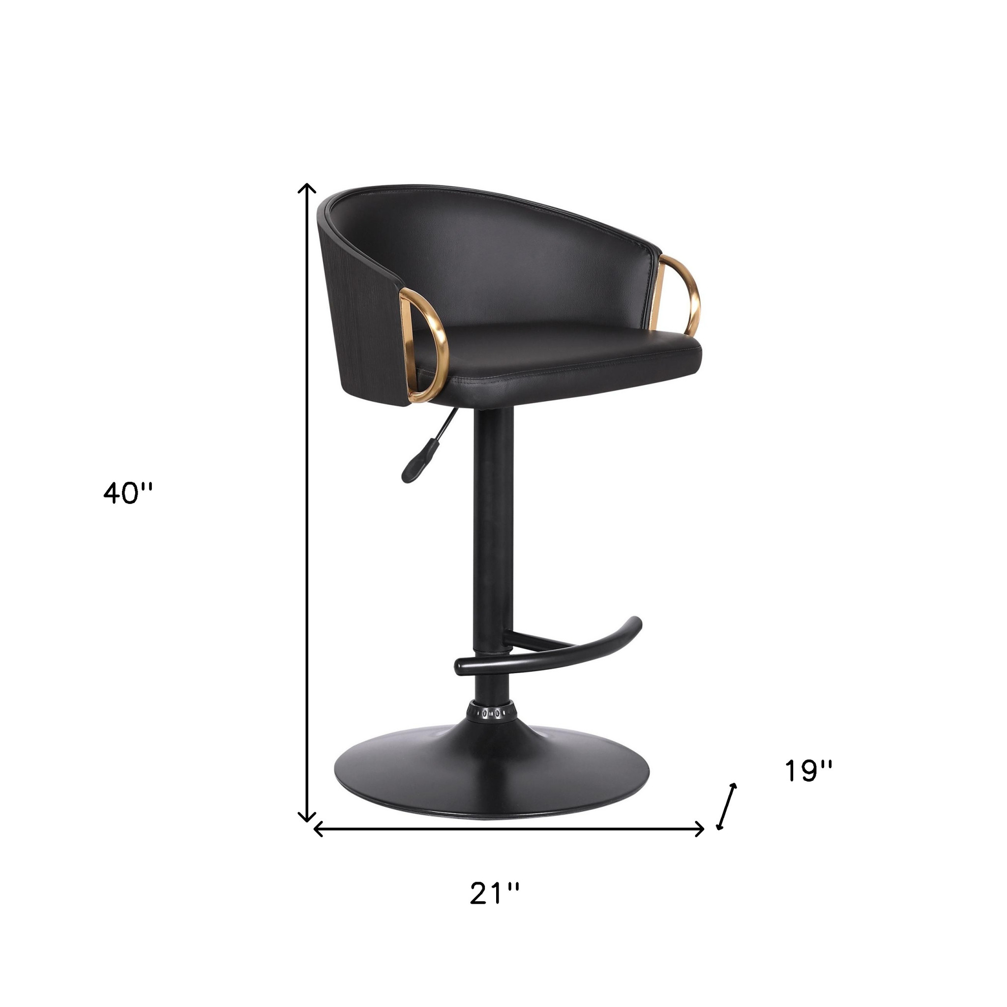 Comfortable enough to sit in for awhile, this black iron faux leather and fabric low back adjustable height swivel bar chair will transcend the look of your room. The base of this stool is made from iron in a black, that matches the faux leather, also in black. Too add some visual interest, this chic chair also includes gold metal accents at the handles. A low wrap around back mixed with a round shaped seat design makes this chair both comfortable and fashionable. 40-inch h x 21-inch w x 19-inch d.