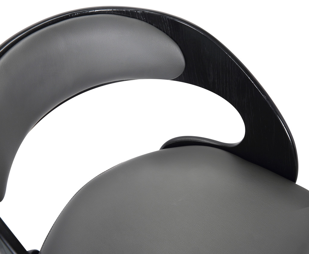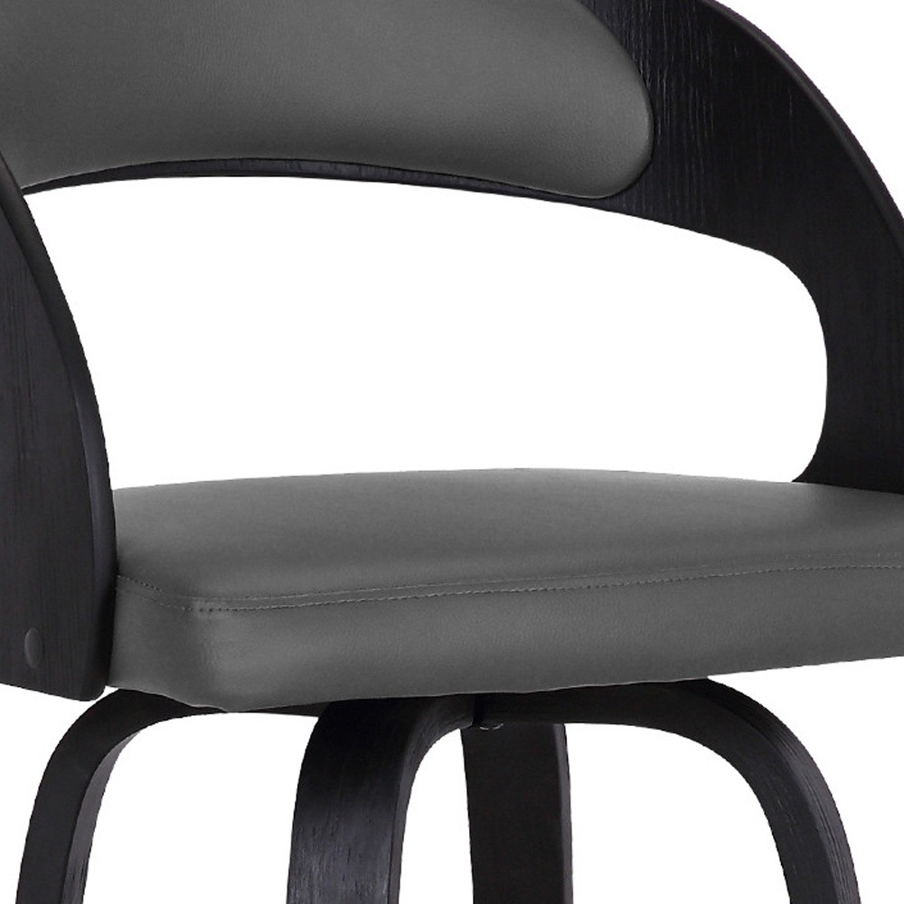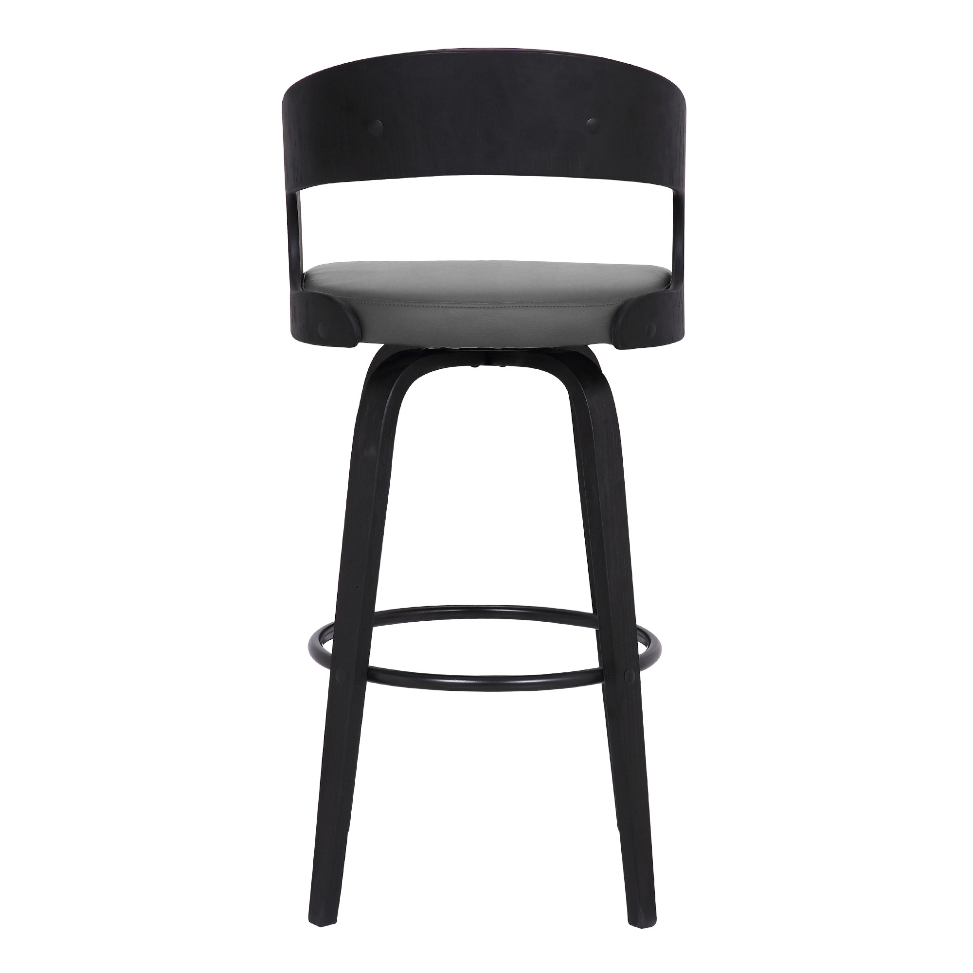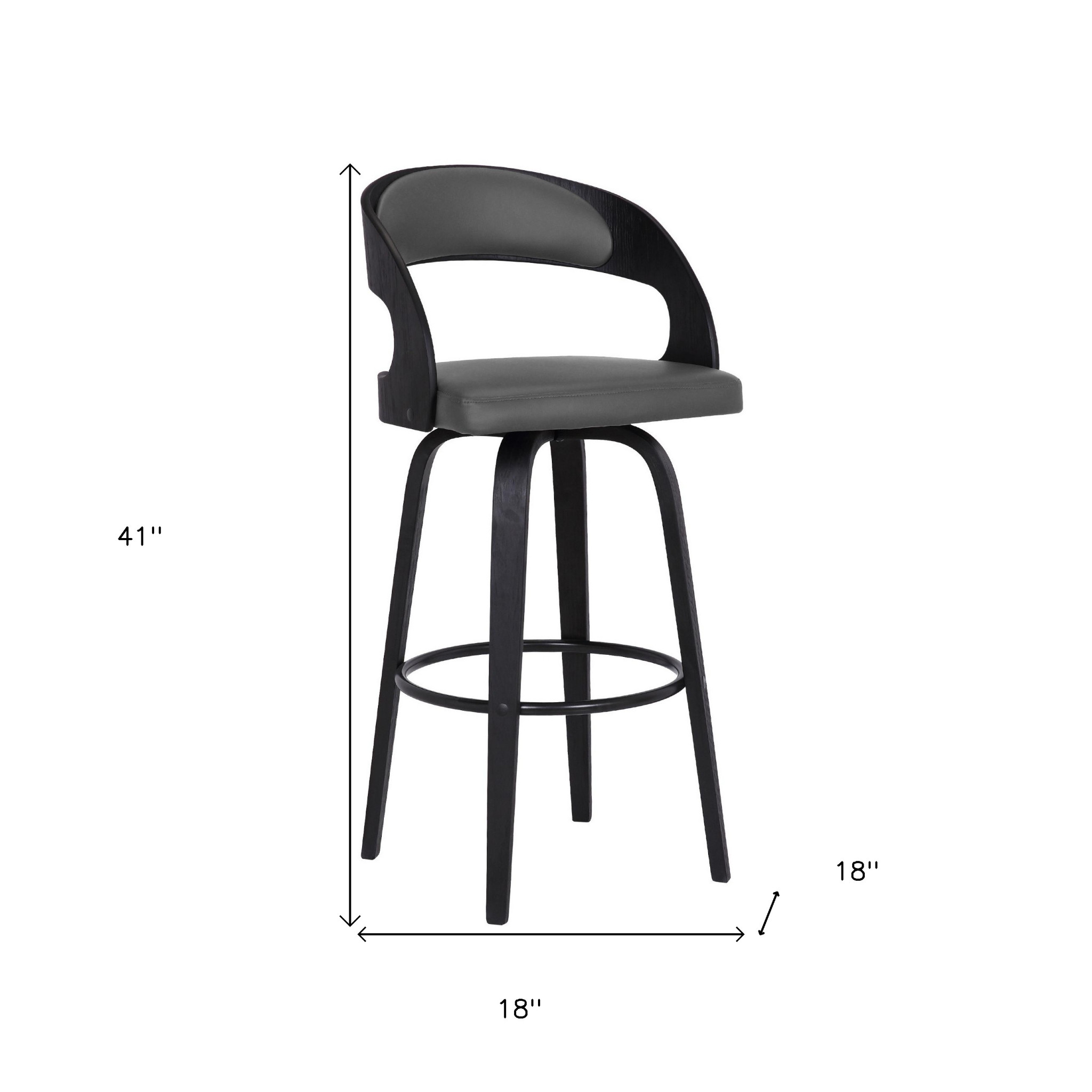 This exceptionally stylish and elegant Gray Faux Leather Modern Black Wooden Bar Stool is the perfect accent to your home with its classy chic vibe and modern essence. Showcasing a gray faux leather smooth-textured cushion and back, with a black wooden frame wrapped around, this bar stool exudes timeless beauty with a striking visual appeal. It features an ergonomic 360-degree rotatable function with footrest that allows to turn to any direction conveniently without moving. The stool also has an open chair back that allows a refreshing breathable seating experience and optimal comfort with the help of its plushy soft durable seat cushions. Thanks to its enchanting presence and functionality, this stunning bar stool is an absolute must-have whether it is for your kitchen, office, home bar or patio. 41” x 18” x 18”