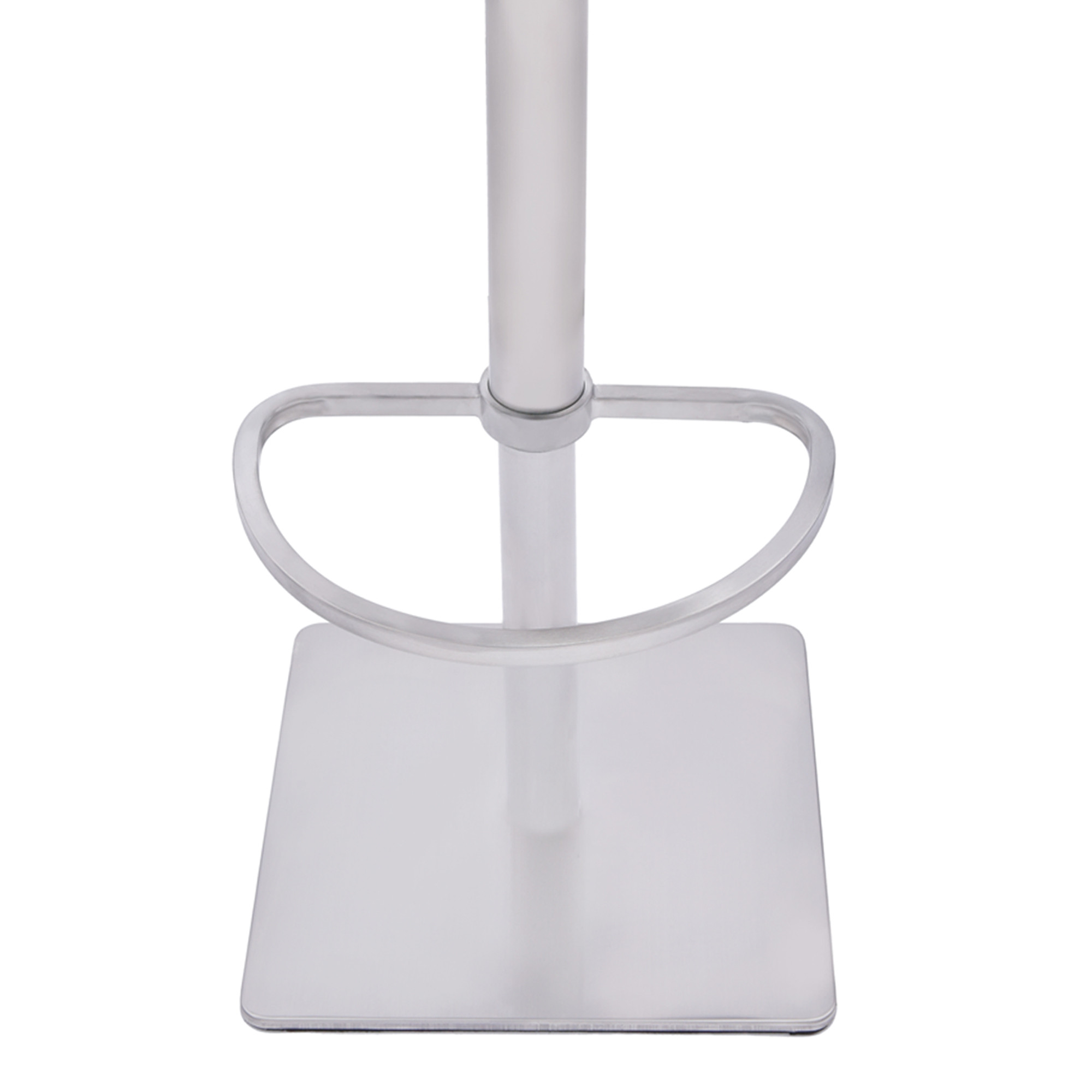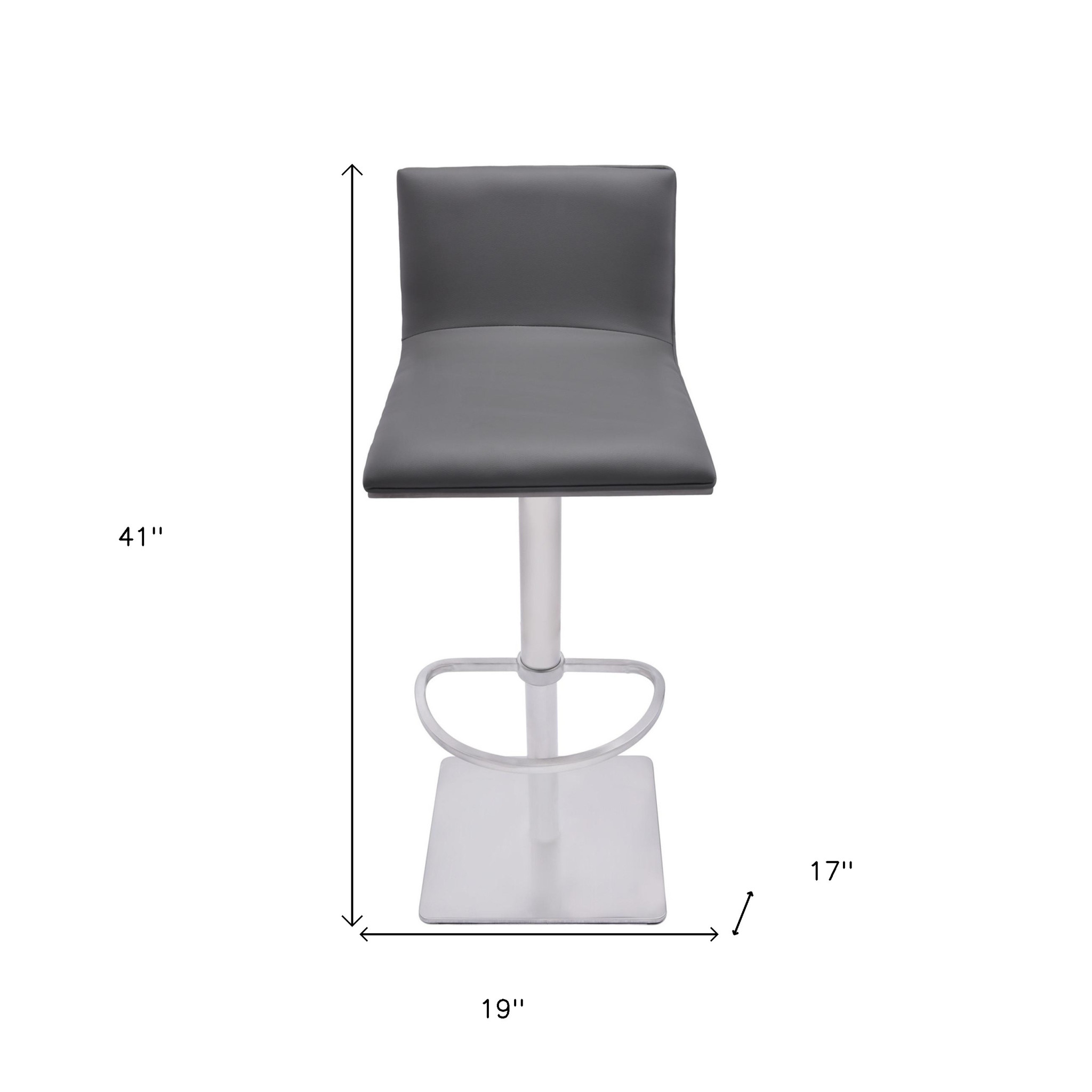 Please your guests and welcome them into comfort and unrivaled style with this Grey Faux Leather Walnut and Stainless Swivel Adjustable Bar Stool. The brushed stainless steel frame beautifully contrasts the rich faux leather upholstery that houses the cushioned seat where you and your friends can enjoy optimal comfort in the most luxurious manner possible. The stain-resistant stainless steel frame is home to a convenient footrest that provides enough stability and balance even when the stool's 360-degree swivel function is in action. The stool dons a simple but effective geometric cut-out design that will leave anyone stunned as soon as they set their eyes on it. The stool can also be adjusted to your preferred height, leaving you in total control of how much convenience and comfort you get to enjoy. 41" x 19" x 17"