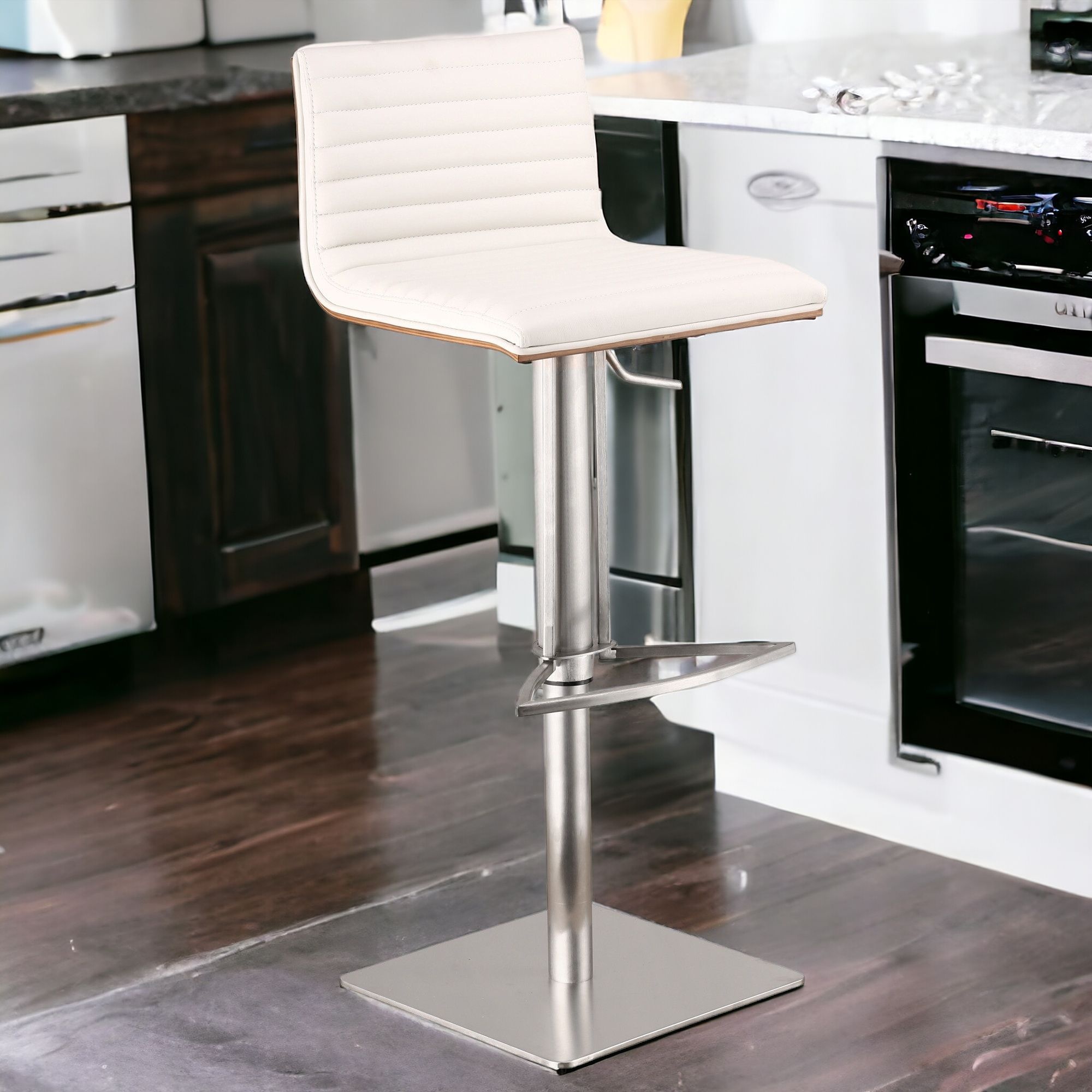 faux leather walnut bar stool, cafe adjustable height swivel white, height swivel white faux leather, stool brushed stainless steel base, cafe adjustable height swivel |