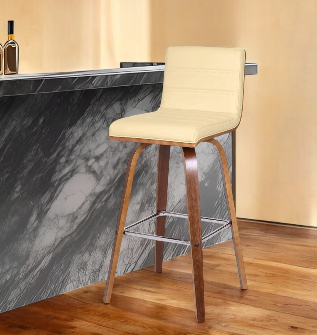 Comfort and design come together nicely in this 30-inch cream and brown fabric and iron low back bar height swivel bar chair. A brown iron frame is finished off with a cream fabric seat that is the epitome of quality construction and design. The round shape of the seat combines with a low_back to give this chair a comfortable and fashionable look. Designed with a footrest for comfort and convenience. 39-inch h x 17-inch w x 20-inch d.