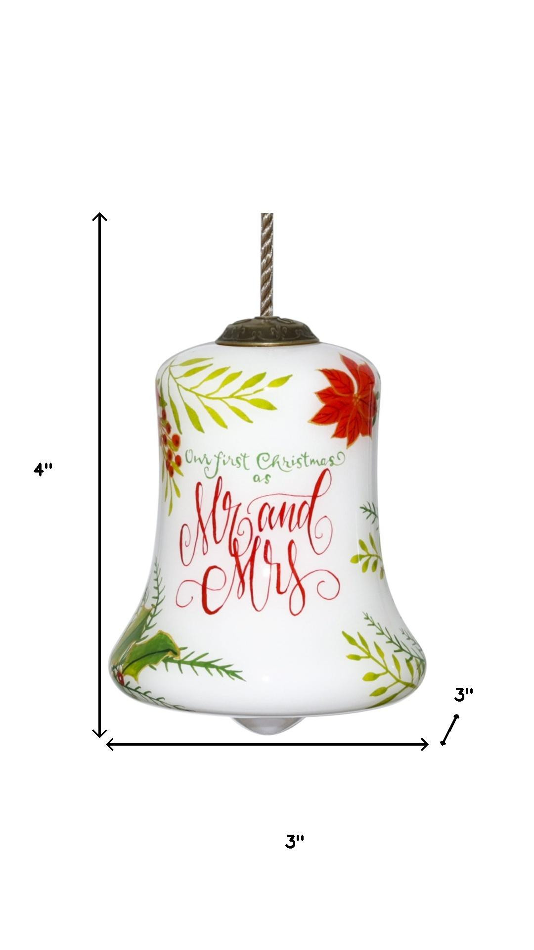 Celebrate one of the greatest moments in your life this Christmas season with the Mr. & Mrs. Our First Christmas Hand Painted Mouth Blown Glass Ornament. Using old world intricate techniques, the glass is hand-painted on the inside by skilled artisans. This gorgeous bell shaped ornament will be a treasured keepsake for your tree but can also be hung easily on an ornament stand. 4" x 3" x 3"