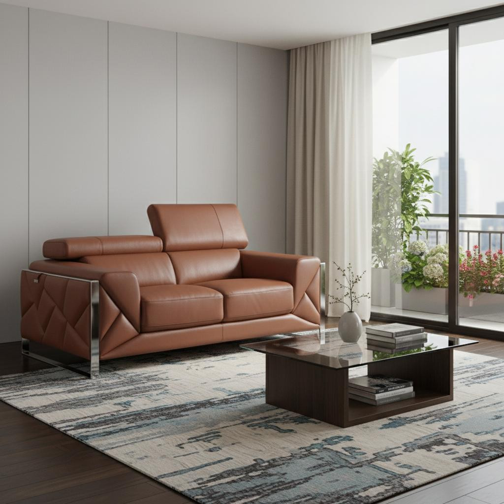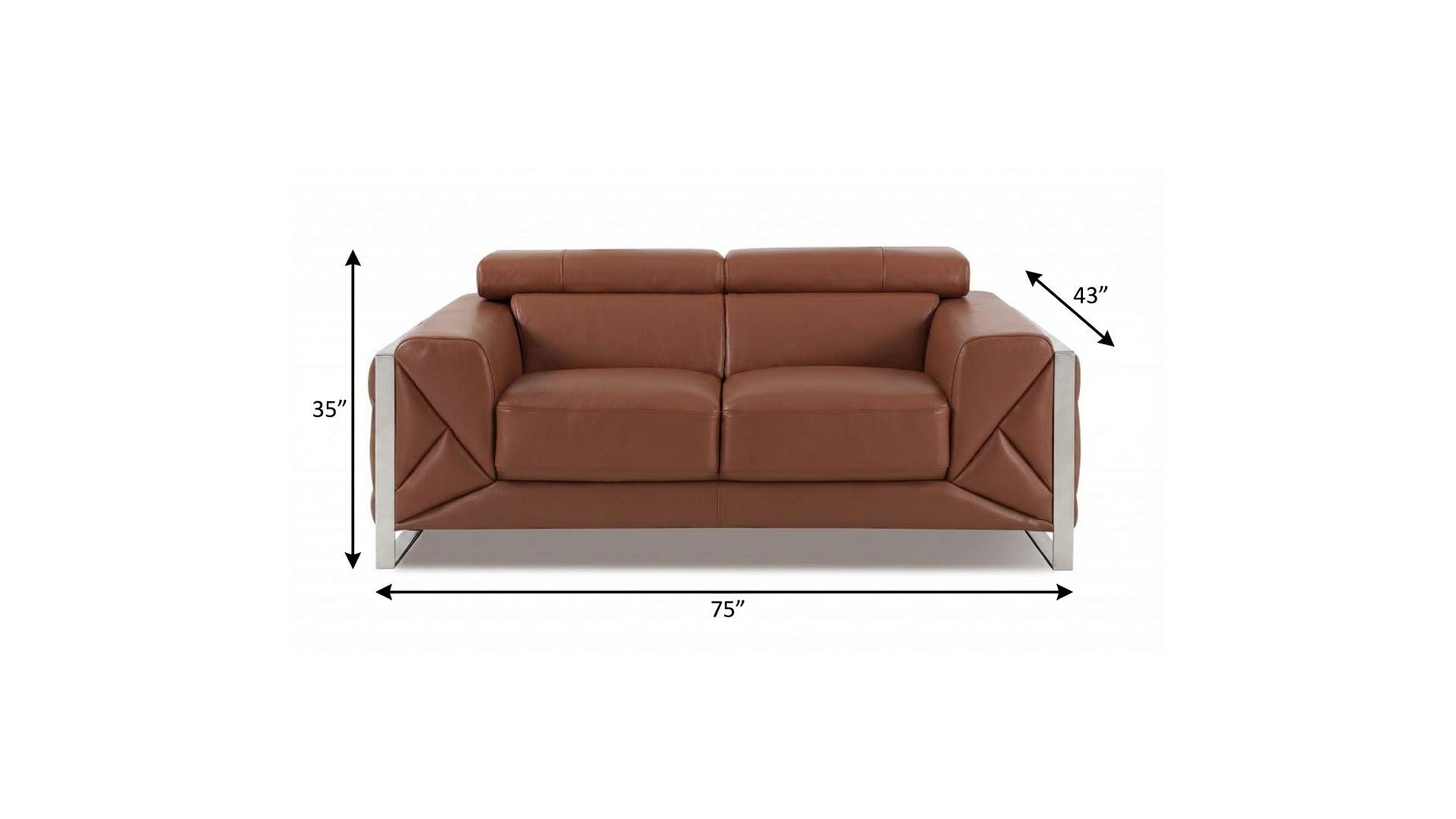 An interior designer's dream, this buttery soft high grade leather 75-inch camel and silver italian leather loveseat will bring just the right touch to your space. The high grade premium leather used makes your lounging luxuriously comfortable and adds an elegant appeal to your space. Square arms offer a comfy place to rest and give this piece some interest and shape. Silver metal legs effortlessly elevate the room and add a touch of contemporary design. A great showpiece for your room, this sofa is a must have. 35-inch H x 75-inch W x 43-inch D
