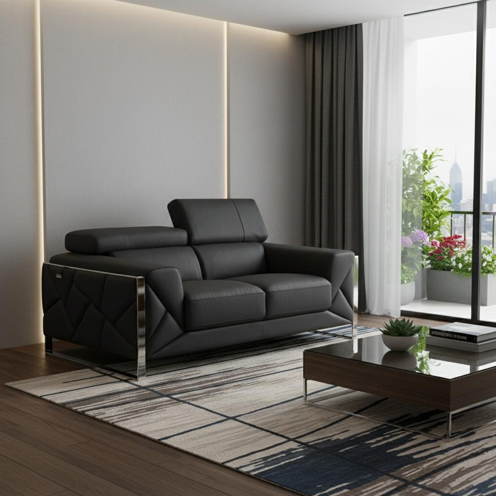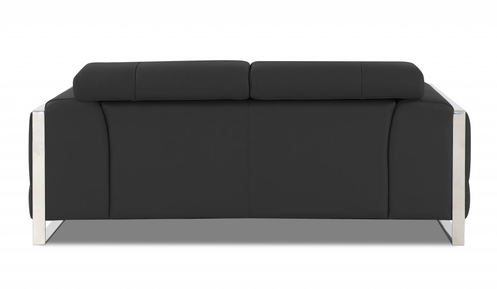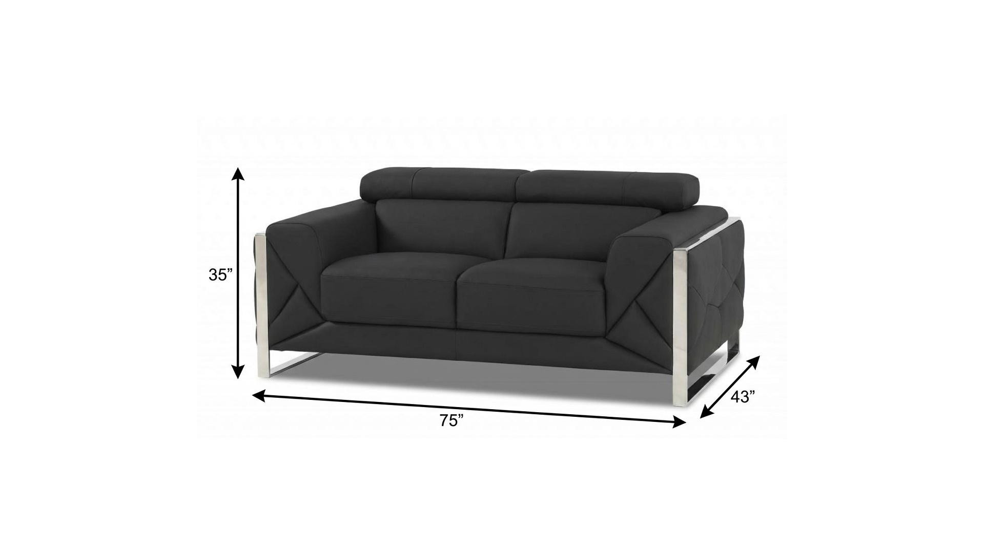 Superior construction from fabulously soft and high grade leather gives this 75-inch gray and silver italian leather loveseat a leg up on the competition. The high grade premium leather used makes your lounging luxuriously comfortable and adds an elegant appeal to your space. Square arms offer a comfy place to rest and give this piece some interest and shape. Silver metal legs effortlessly elevate the room and add a touch of contemporary design. A great showpiece for your room, this sofa is a must have. 35-inch H x 75-inch W x 43-inch D