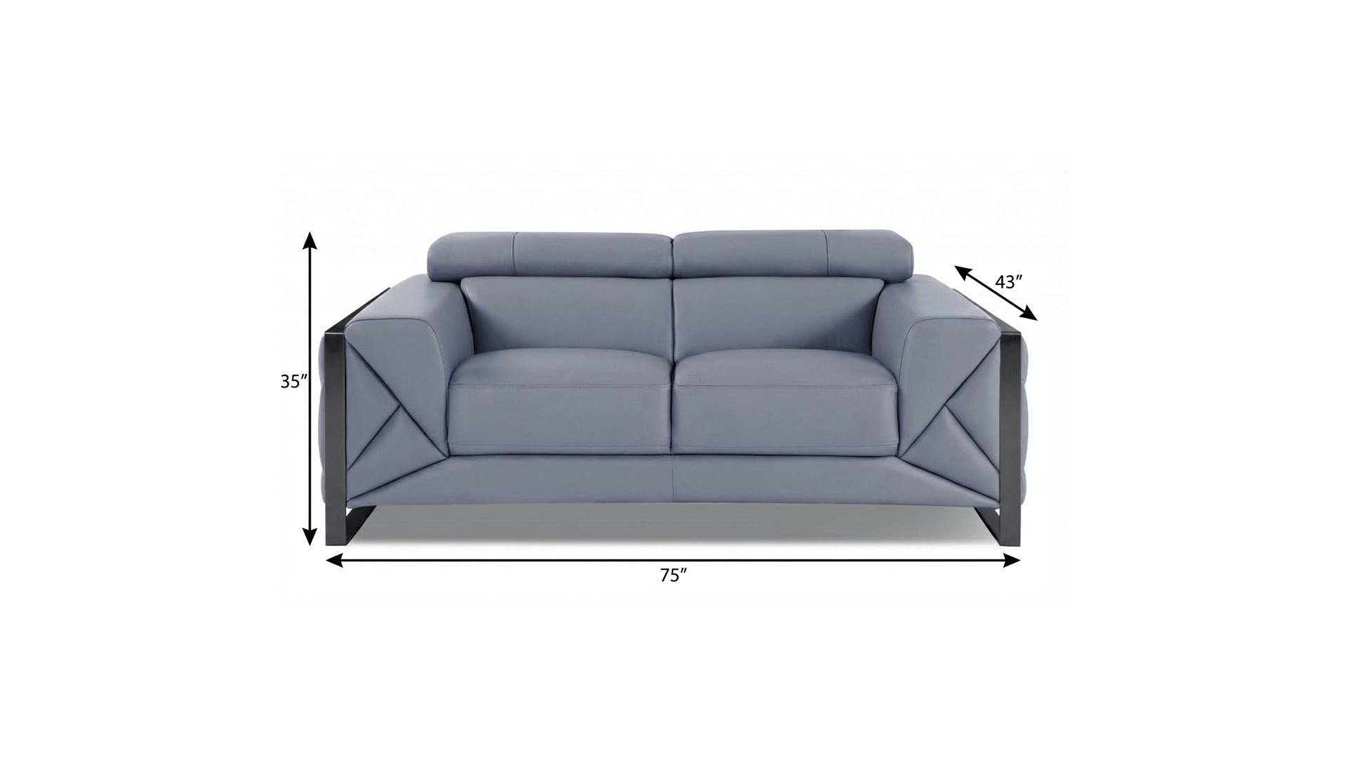 An interior designer's dream, this buttery soft high grade leather 75-inch light blue and black italian leather loveseat will bring just the right touch to your space. The high grade premium leather used makes your lounging luxuriously comfortable and adds an elegant appeal to your space. Square arms offer a comfy place to rest and give this piece some interest and shape. Black metal legs effortlessly elevate the room and add a touch of contemporary design. A great showpiece for your room, this sofa is a must have. 35-inch H x 75-inch W x 43-inch D