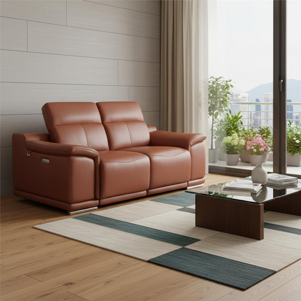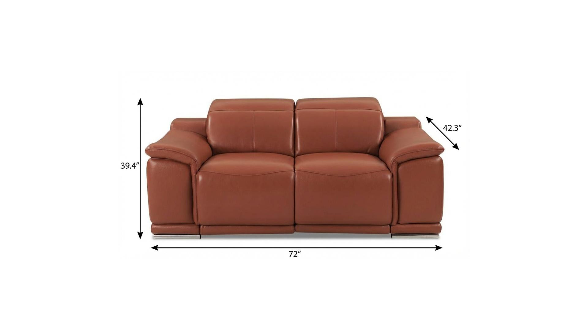 An interior designer's dream, this buttery soft high grade leather 72-inch camel and silver italian leather power reclining love seat will bring just the right touch to your space. The high grade premium leather used makes your lounging luxuriously comfortable and adds an elegant appeal to your space. Pillow top arms offer a comfy place to rest and give this piece some interest and shape. Silver metal legs effortlessly elevate the room and add a touch of contemporary design. A great showpiece for your room, this sofa is a must have. 39.4-inch H x 72-inch W x 42.3-inch D