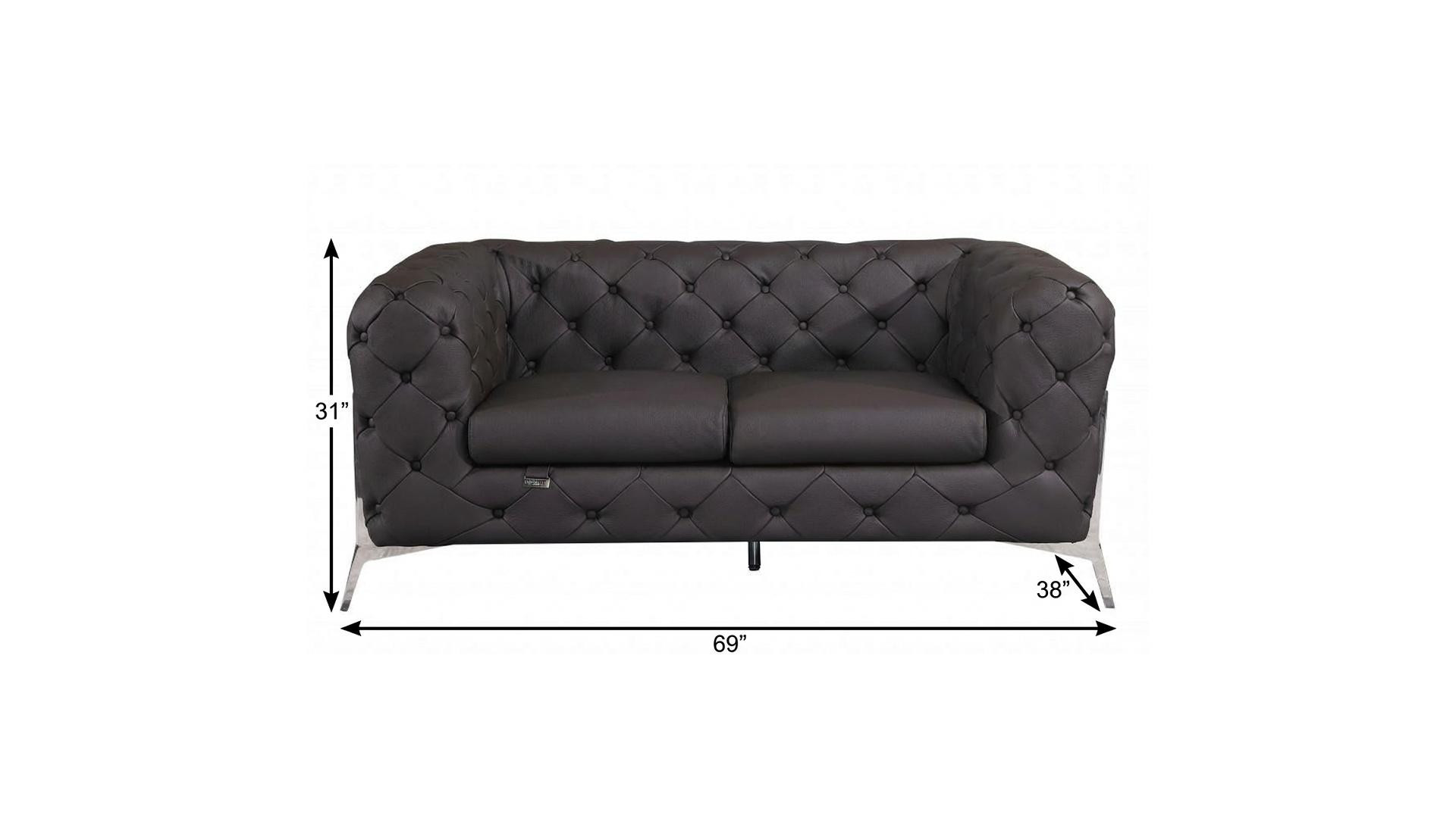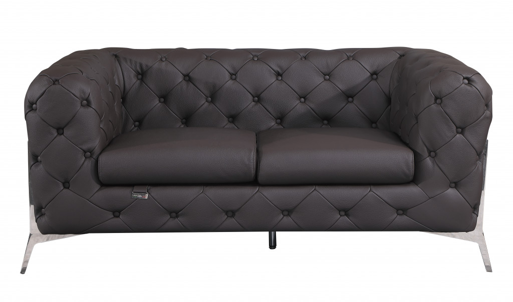Superior construction from fabulously soft and high grade leather gives this 69-inch brown and silver italian leather loveseat a leg up on the competition. The high grade premium leather used makes your lounging luxuriously comfortable and adds an elegant appeal to your space. Tuxedo arms offer a comfy place to rest and give this piece some interest and shape. Silver chrome legs effortlessly elevate the room and add a touch of contemporary design. A great showpiece for your room, this sofa is a must have. 31-inch H x 69-inch W x 38-inch D
