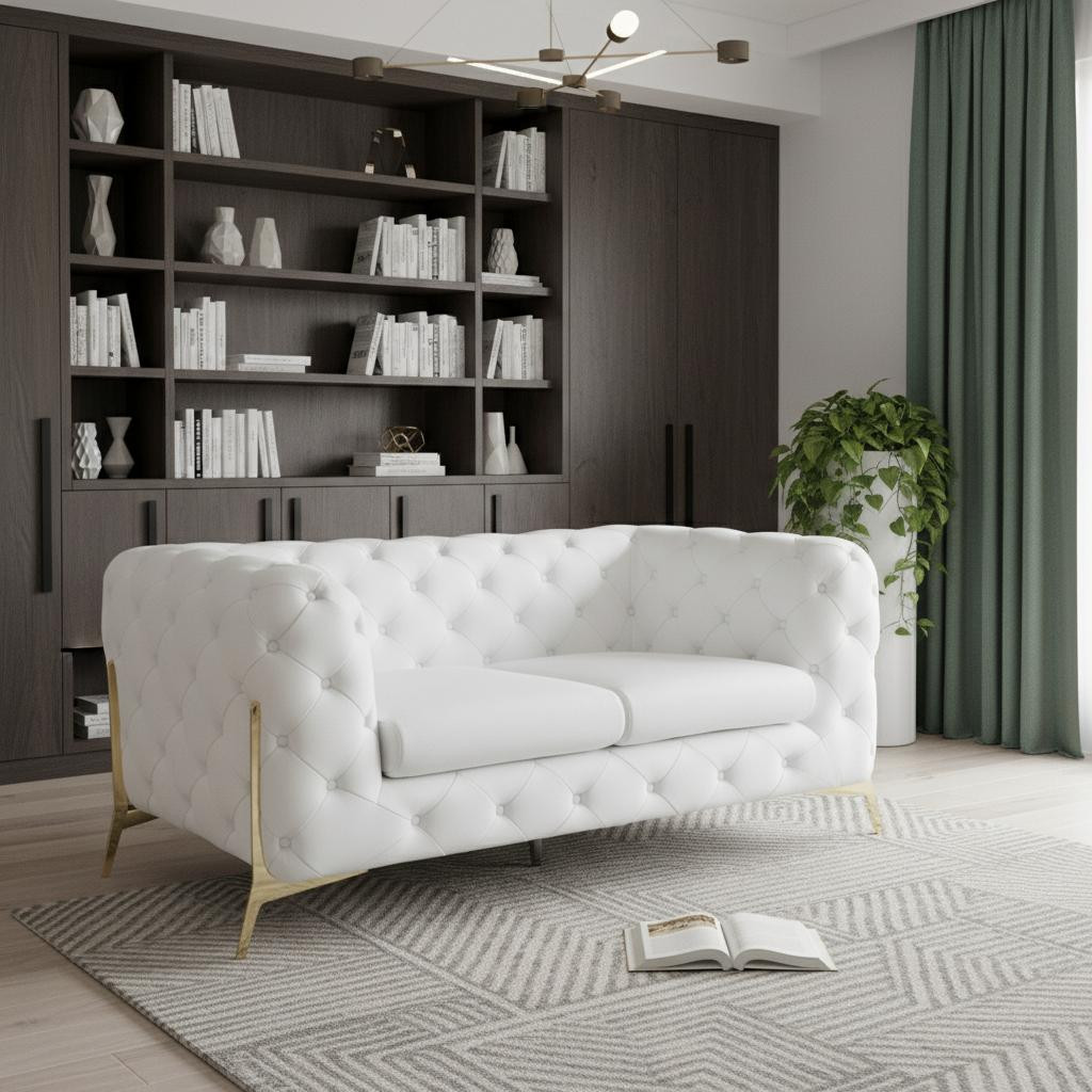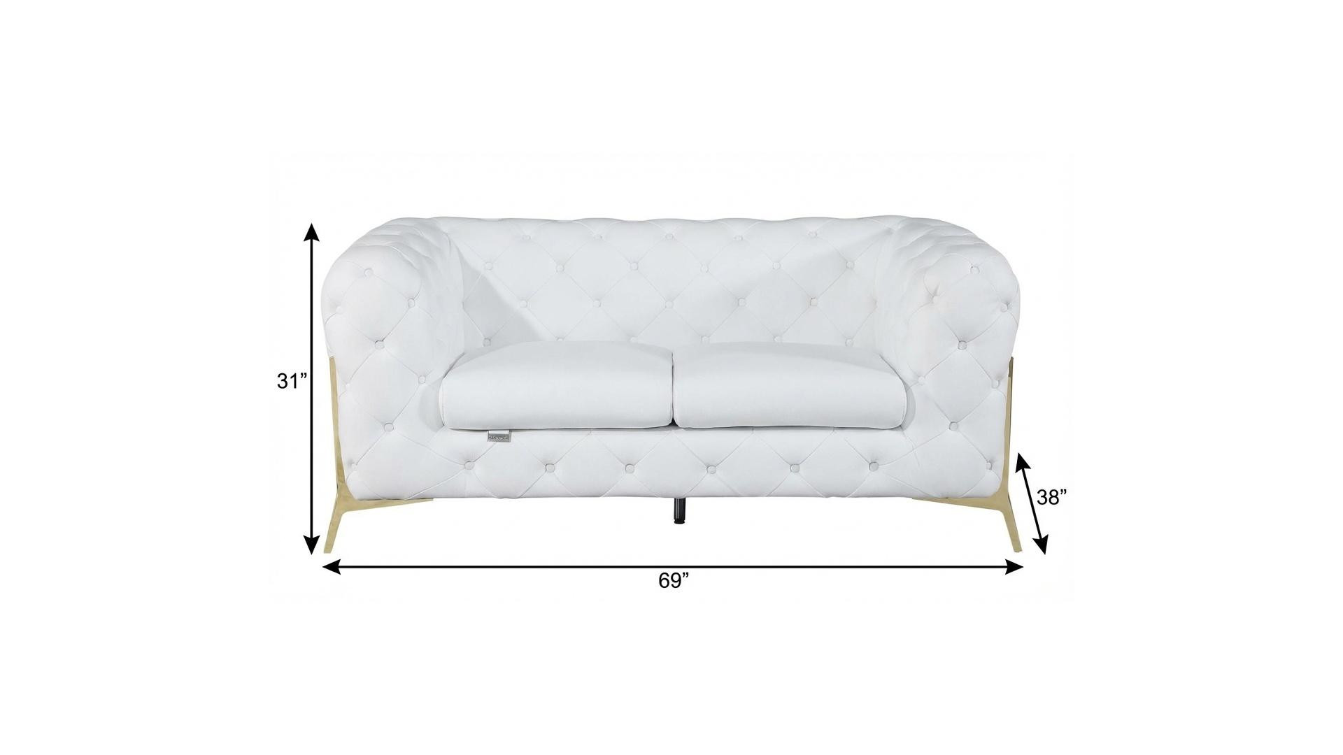 Made of top quality, supple leather, this 69-inch white and gold italian leather loveseat will be the star of your space. The high grade premium leather used makes your lounging luxuriously comfortable and adds an elegant appeal to your space. Tuxedo arms offer a comfy place to rest and give this piece some interest and shape. Gold metal legs effortlessly elevate the room and add a touch of contemporary design. A great showpiece for your room, this sofa is a must have. 31-inch H x 69-inch W x 38-inch D