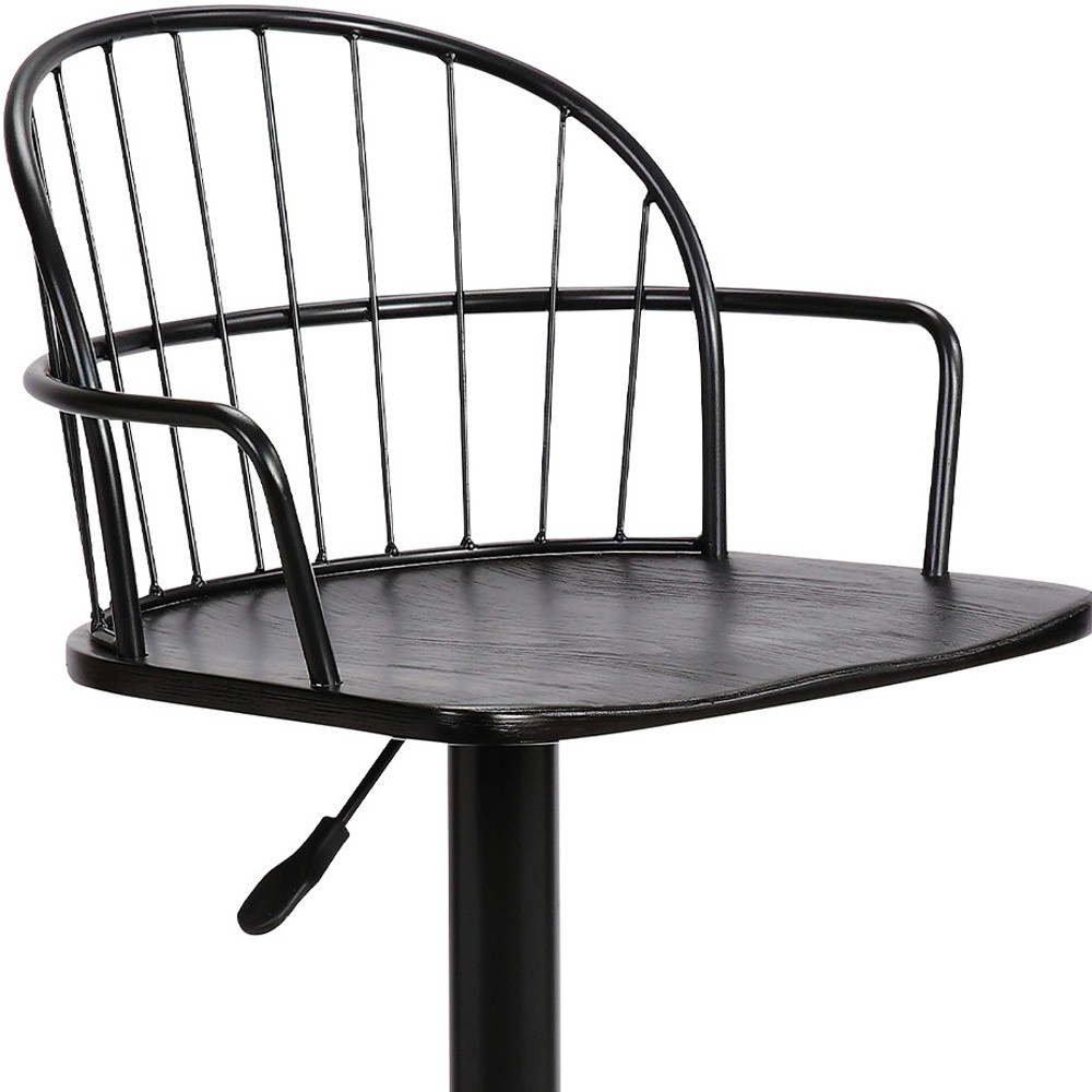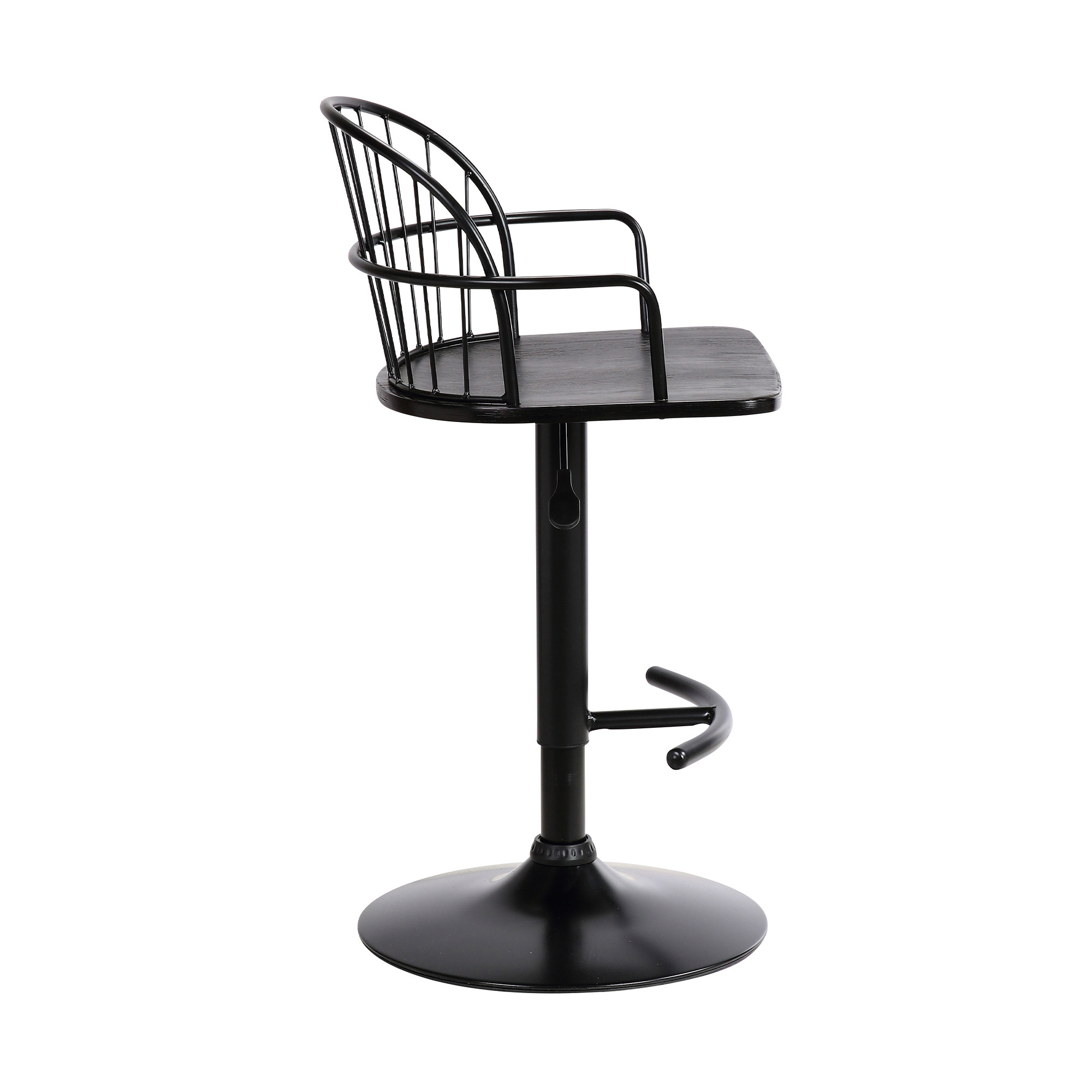Comfort and design come together nicely in this black solid wood and iron low back adjustable height bar chair. The black coloration runs throughout this good looking iron and solid wood stool. Not only good looking and stylish, this chair features a round shaped seat and a low_back for the ultimate in comfort and enjoyment. Designed with armrests for your comfort, this chair also features a footrest for comfort and convenience. 42.5-inch h x 18-inch w x 20-inch d.